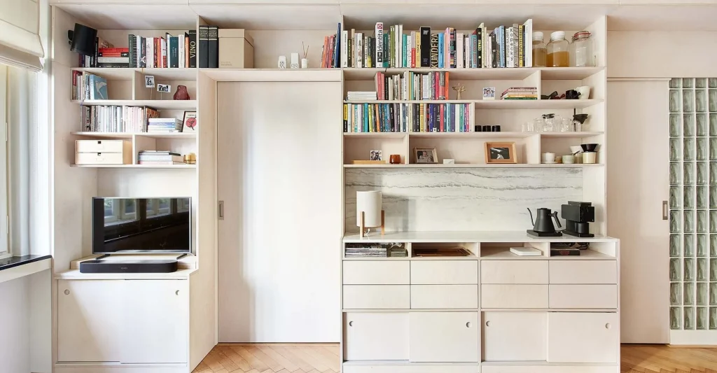 El diseño reinterpreta la distribución original para incorporar dos dormitorios conectados por una estantería estratégica. Con mobiliario empotrado, un sistema de ventilación oculto y la restauración del parqué, este apartamento en Europa gana funcionalidad, confort y continuidad visual.