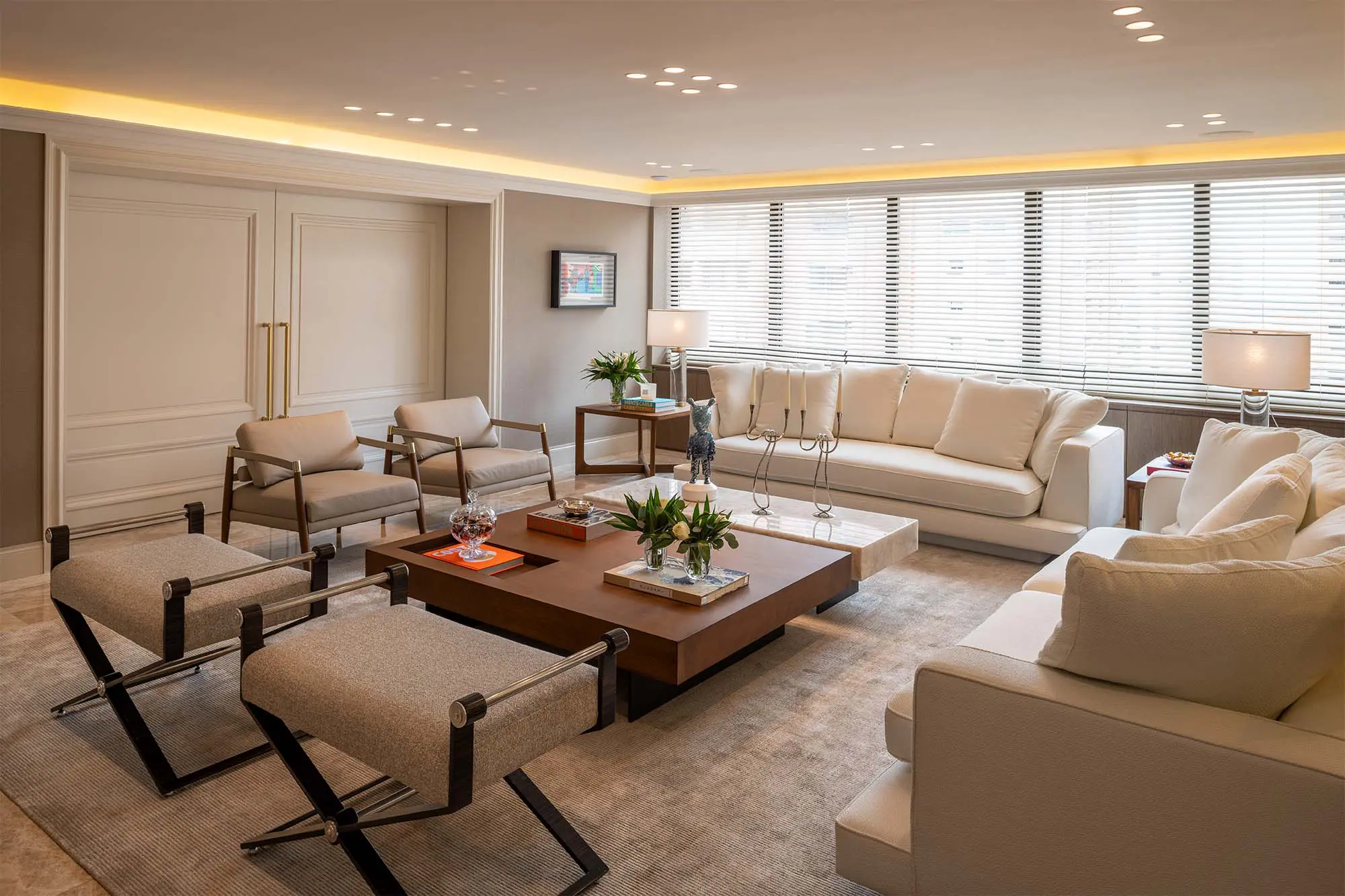 “Para ello nos inspiramos en los interiores de las viviendas parisinas, que en sus versiones más tradicionales presentan frisos y molduras, elementos que están en desuso, pero que reinterpretamos en las puertas y el cielorraso con dos objetivos: incorporar acentos clásicos y mantener oculta la red del aire acondicionado”, explica Sergio Del Gordo Kligman, cofundador —junto con Carolina Barvo Ortiz— de la firma barranquillera Kligman Studio, encargada del diseño y la construcción.