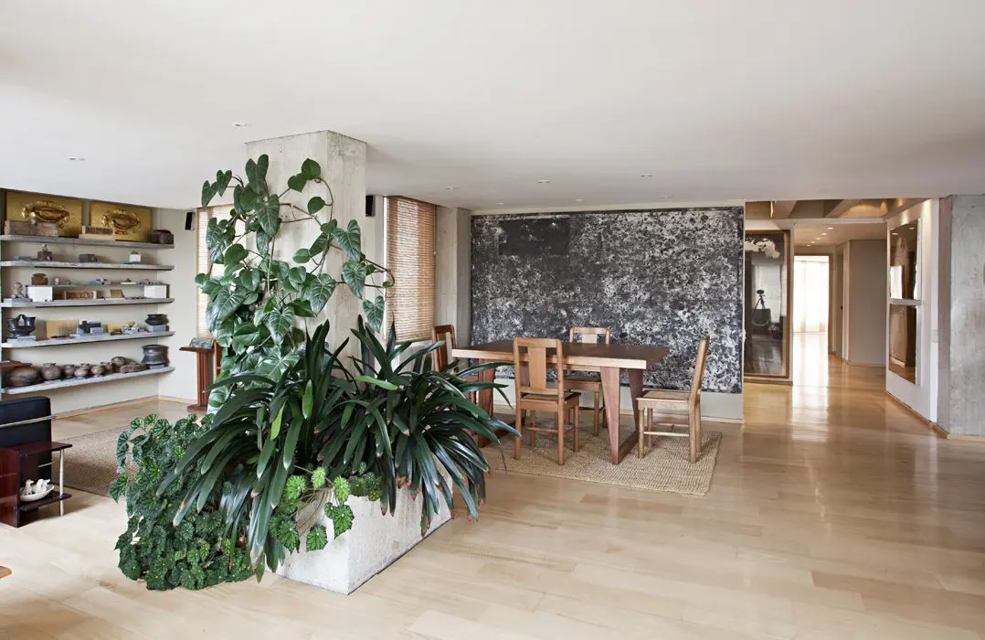 Él encontró prácticas soluciones para modernizar el ambiente. Por ejemplo eliminó la pared que dividía el comedor del estudio y los integró quitando tanto la estantería como la chimenea, solo dejó una columna, que antes tenía un acabado de ladrillo. La desnudó para vestirla con la jardinera que hoy la rodea y que la transforma en protagonista.