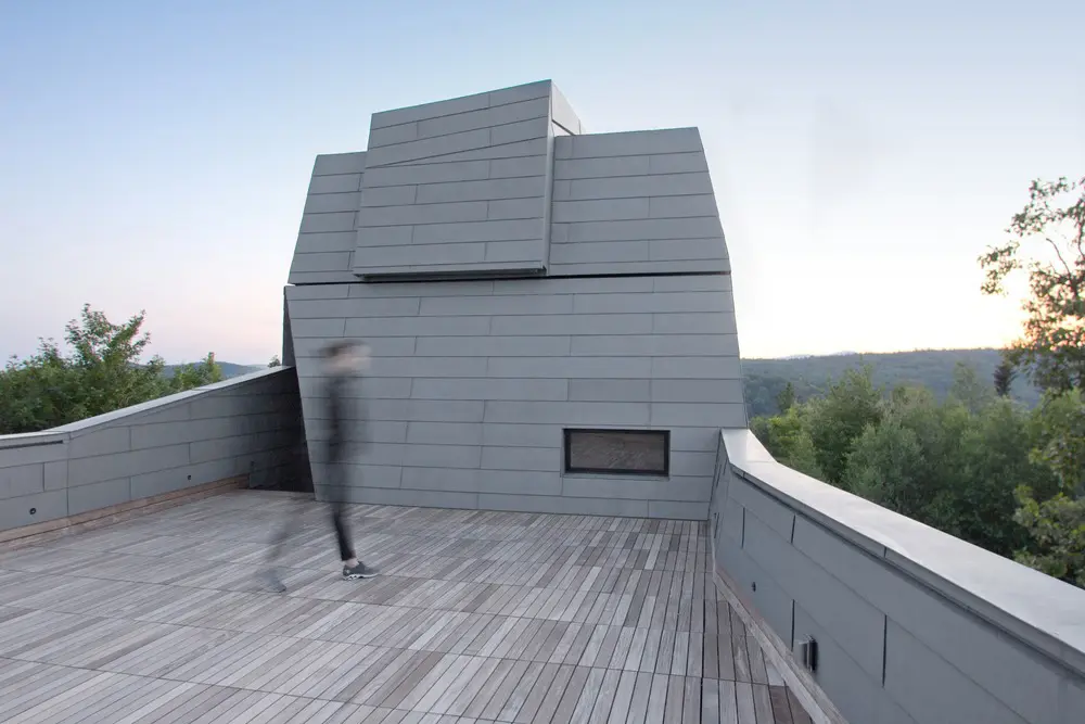 Un patrón no convencional de revestimiento de cinc con cerradura media entre la topografía irregular del sitio y la geometría del edificio, refleja la orientación de Gemma tanto a los hitos geológicos como celestiales. Su dimensión, color y pátina evocan una relación material con los afloramientos de granito gris, mientras que su capacidad de transferencia de calor facilita la observación del cielo al minimizar la distorsión de la temperatura diferencial.