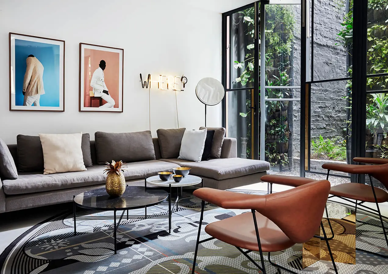 La sala de estar en la planta baja está llena de objetos del diseñador británico Tom Dixon y de otros icónicos (la compañía del propietario, Créma Design, importa piezas a Sudáfrica, muchas de las cuales inevitablemente se han convertido en accesorios permanentes en su hogar). El segundo piso está compuesto por dos habitaciones, un baño y un espacio abierto que crea un “patio en el aire”. “Es genial tener un área exterior en el nivel del dormitorio. Pasamos las mañanas tomando café y leyendo el periódico. También conecta el cuarto de invitados con el principal, lo que lo hace más social”, explica Craig.