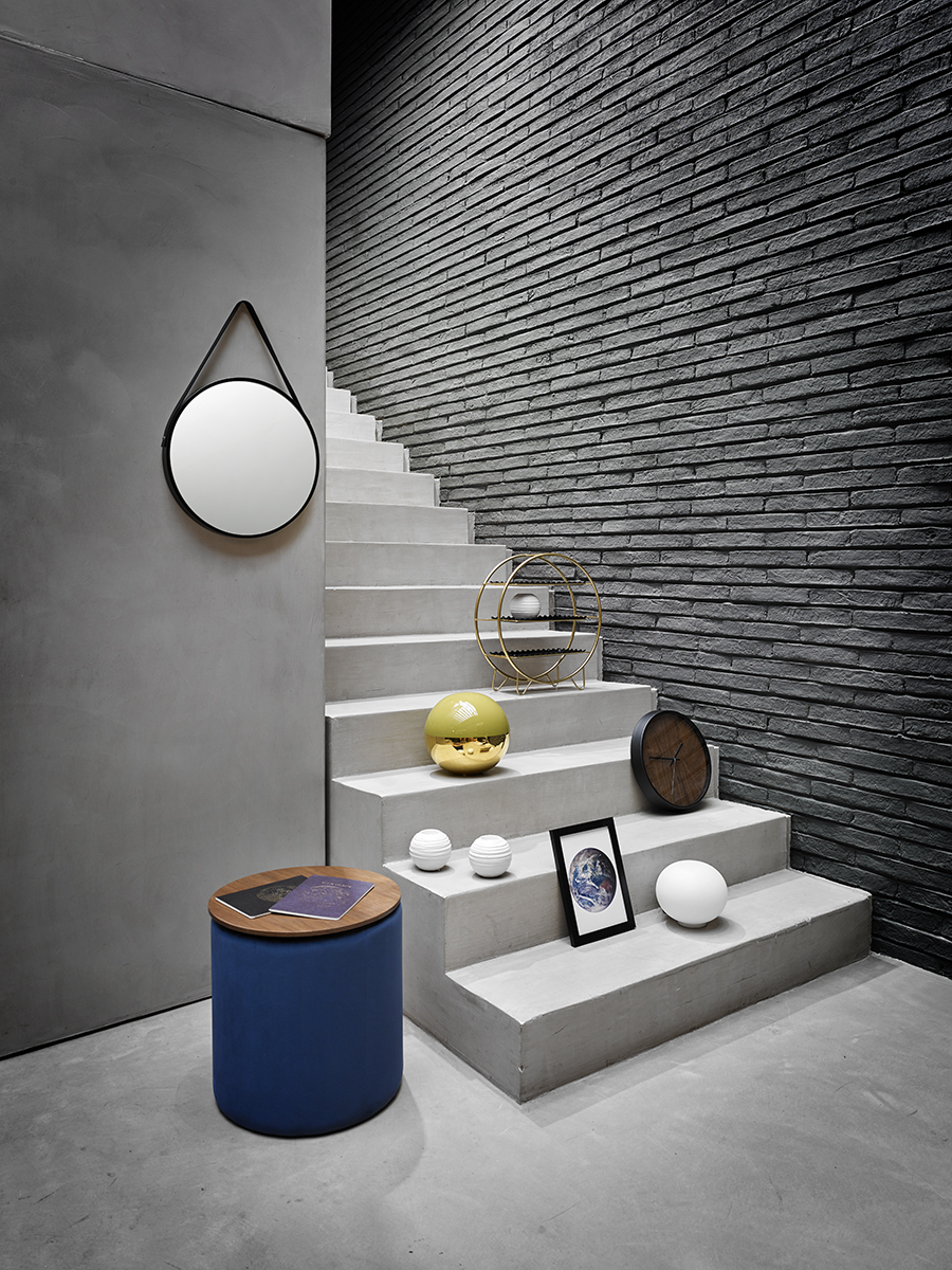Espejo redondo negro, ref. Colan; mesa auxiliar, ref. Dita Almacenamiento, de terciopelo y madera color nogal; cuadernos, ref. La Luna y Celestial, de papel reciclado; set x 3 de cuadros, ref. Travel, World & Awesome; portavelas, ref. Romina, de porcelana blanca; reloj de pared de madera, color negro y nuez; repisa, ref. Círculo Trail, de metal dorado y entrepaños negros, todo lo anterior de Tugó.