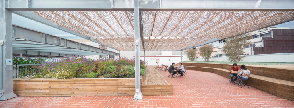 La cubierta, transformada en un ambiente exterior para estar e interactuar, disfruta de la vegetación y está protegida por toldos móviles. Además, incorporaron paneles fotovoltaicos que ofrecen una mayor eficiencia energética y productividad al edificio, para reafirmar el compromiso por parte del diseño con el cuidado del medioambiente.