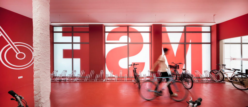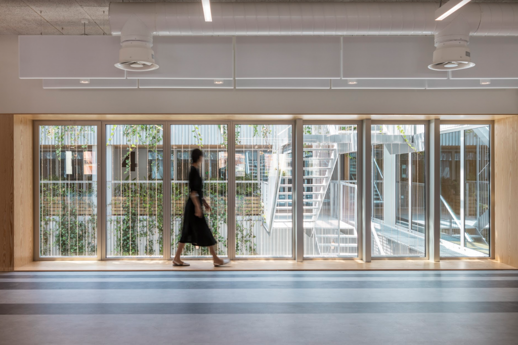 El acceso al inmueble se entiende como una extensión del espacio público: el vestíbulo, que alberga estacionamiento para bicicletas, recepción y auditorio, proporciona un lugar activo que disfruta también del patio como telón de fondo. Los cuatro pisos superiores contienen los espacios de trabajo flexibles organizados también en torno al patio, fomentando la relación con las terrazas y la vegetación.