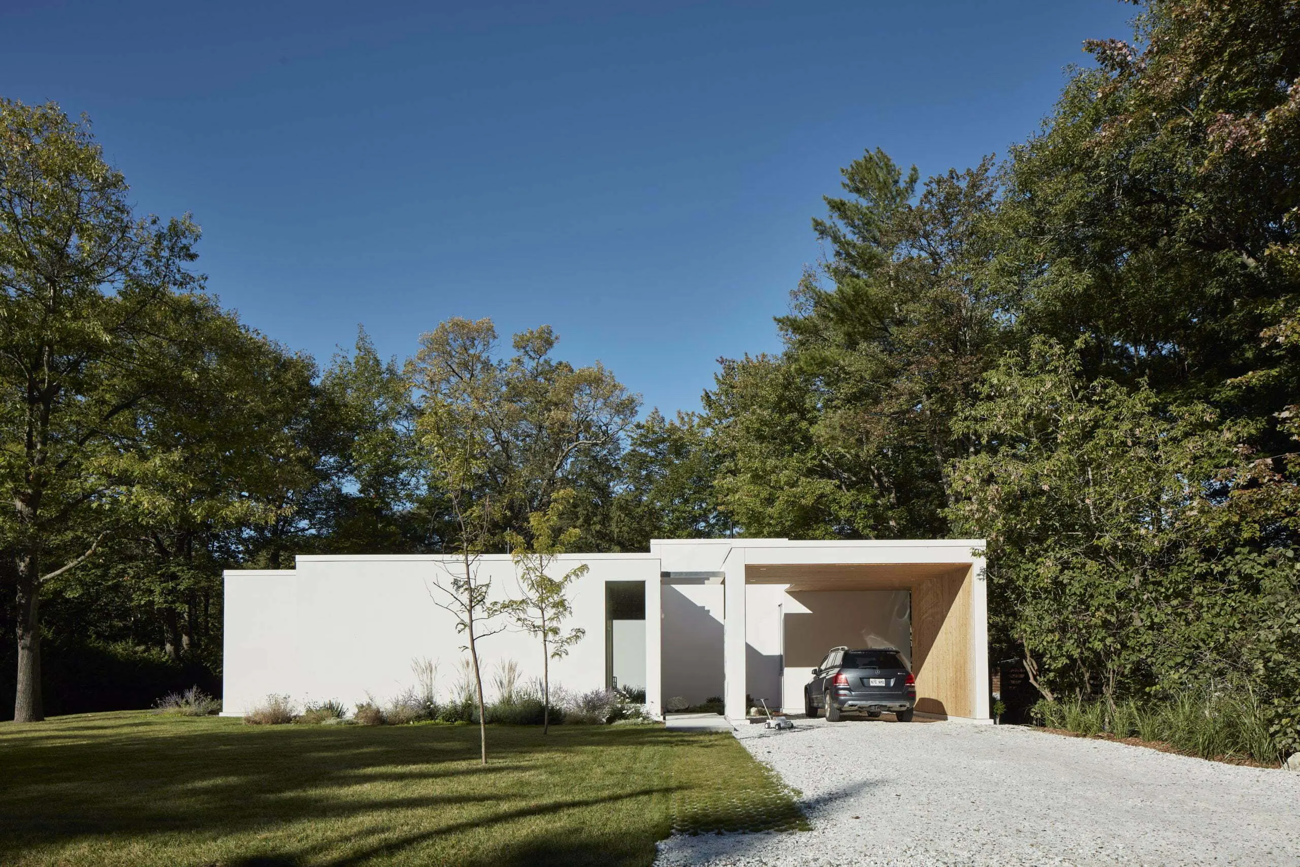 La fuerza del proyecto radica en la atención prestada a los espacios interiores y exteriores. En lugar del tradicional jardín de casa suburbana, el arquitecto ofrece varios espacios exteriores con experiencias variadas. Hay una zona ajardinada para reunirse en torno al fuego, un patio central alrededor del cual se despliega la residencia y que, en verano, permite la continuidad de la cocina y constituye el corazón del proyecto. Por último, otro pequeño patio exterior ofrece protección contra los elementos. Los elegantes patios discurren por caminos de hormigón junto a patios de madera. El paisajismo es pulcro y enriquece las vistas desde los espacios interiores de la casa.