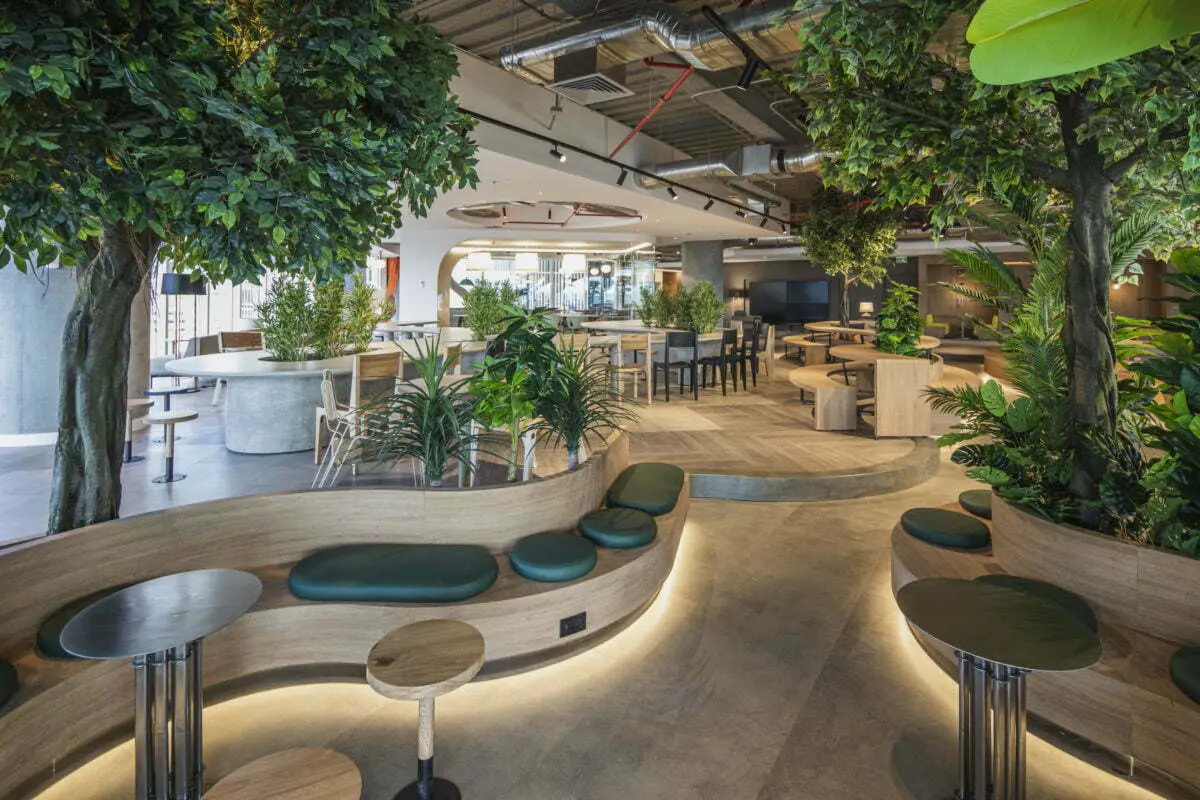 Con esto en mente, la arquitectura del proyecto se beneficia de la planta libre de muros para generar rincones con usos diversos mediante la posición y el diseño del mobiliario. Así, al acceder aparecen nichos de madera para encuentros de dos personas; también pequeñas estancias amobladas como el salón de una casa, otras circulares con sofás curvos en torno a una mesa central. Solo una sala de reuniones está contenida en una caja de vidrio acústico con el fin de garantizar la privacidad sin comprometer las relaciones visuales con el resto del lugar. En medio del espacio surge una serie de bancas sinuosas, enfrentadas entre sí, con jardineras integradas donde sembraron especies tropicales. Este oasis construido permite la contemplación y el aislamiento parcial gracias a la cortina vegetal que crea.