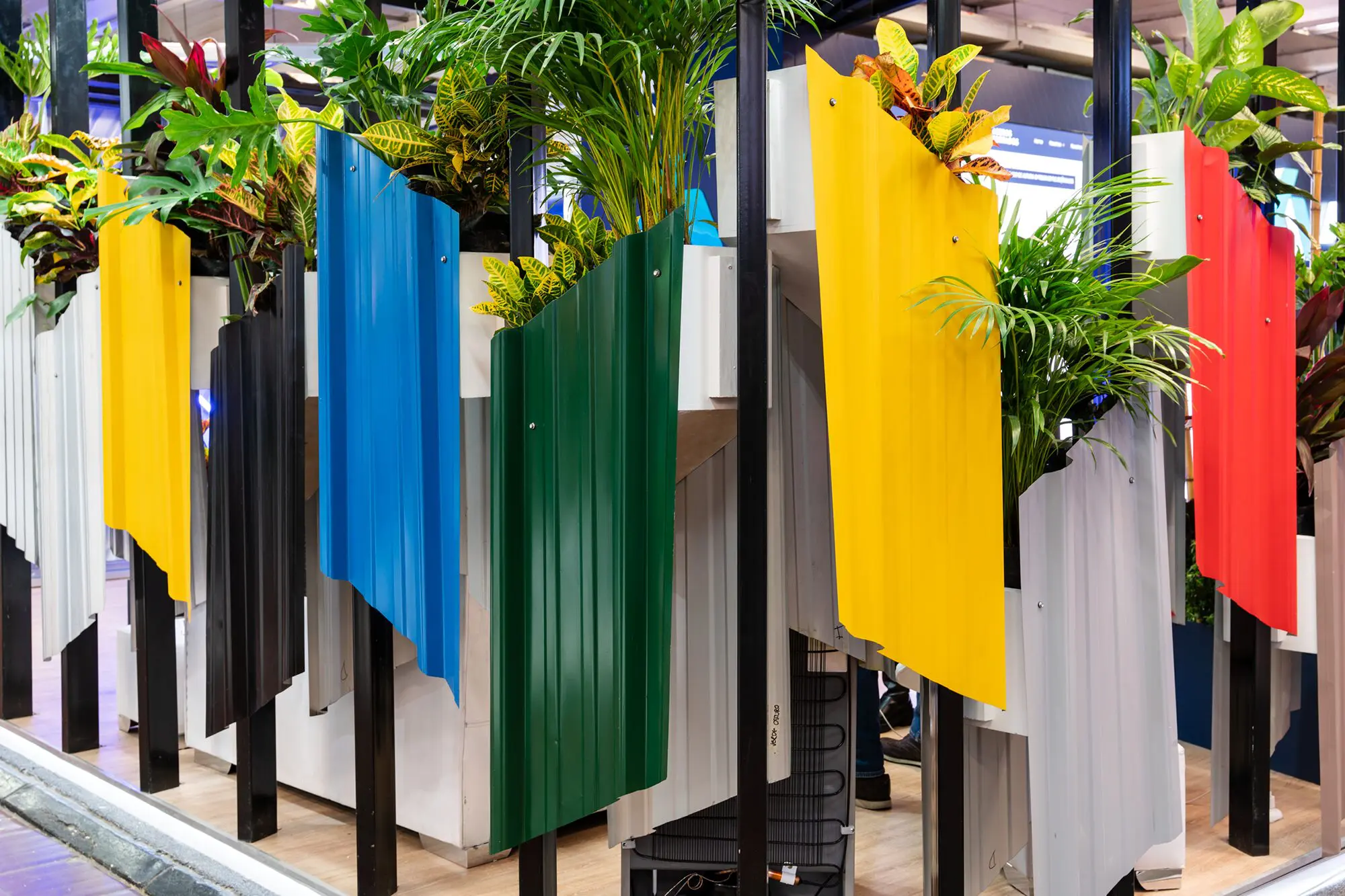 Además del Metaldeck Negro Inspiración, en el estand de Acesco, en Expoconstrucciòn y Expodiseño 2023, instalaron piezas de cubiertas en colores vivos, otra de sus insignias, puesto que para ellos las cubiertas son “la quinta fachada”. No sobra contar que un barista preparó bebidas de primera calidad en una estación de café, que ofrecieron a los visitantes de la marca.