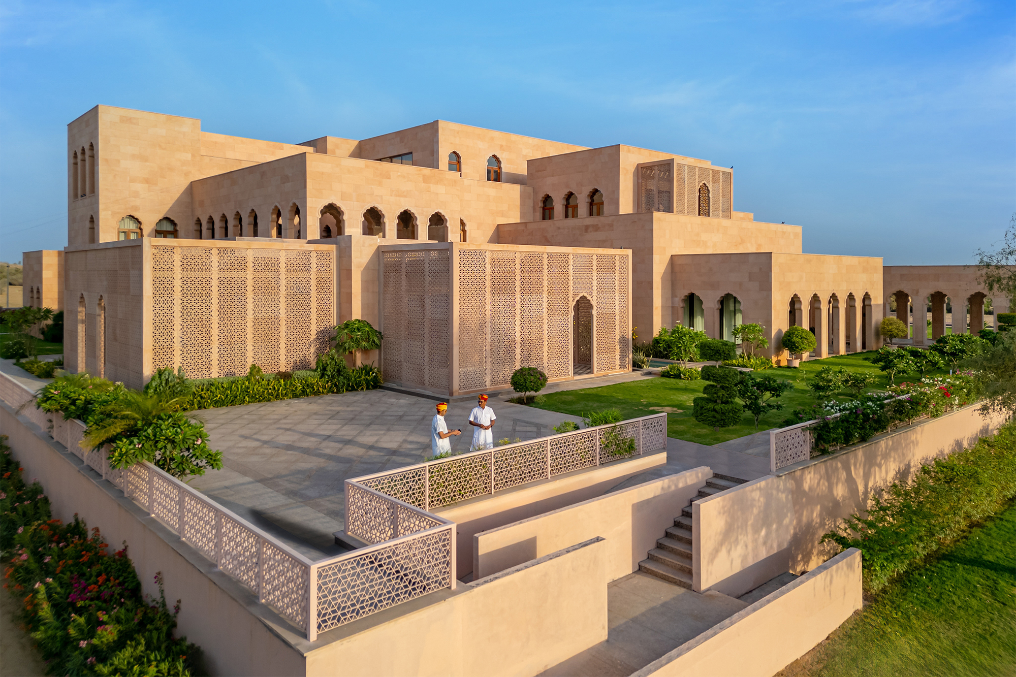 Además de los principios de planificación tradicionales, los elementos de la arquitectura tradicional de Rajasthan, incluidas ventanas arqueadas de múltiples láminas, mamparas de piedra estampadas, pérgolas de piedra, incrustaciones y trabajos de tallado, se encargan de acentuar los espacios.