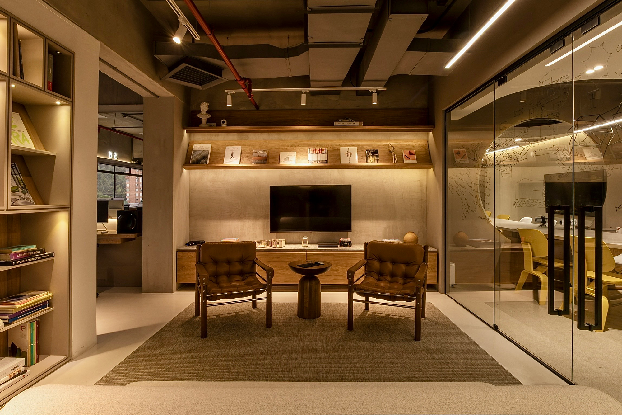 La identidad de Cruz de La Pava se manifiesta en cada uno de los elementos que componen este espacio, mediante la disposición del mobiliario y la elección de los materiales. Las poltronas de cuero y el sofá circular invitan a la interacción, y permiten que el área funcione tanto para reuniones informales como para momentos de relajación.