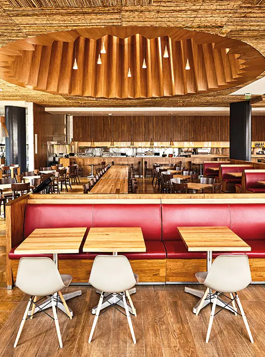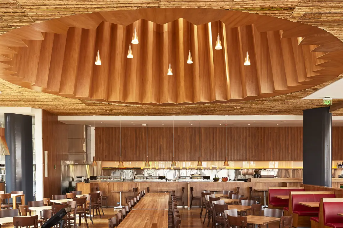 El ingreso a través del patio plantea un juego en el cual el visitante no termina de saber si está adentro o está afuera hasta que llega a la planta superior, donde finalmente se encuentra con el área principal; un espacio de atmósfera cálida y hogareña construido a través del extensivo uso de la madera y el bambú.