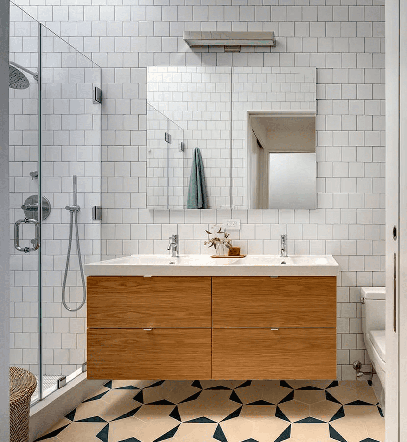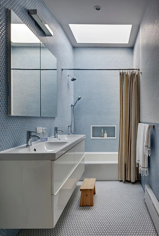 Elementos claves de roble se mezclan con baldosas de cemento y mosaicos de cerámica azul y blanca, en los baños de esta casa en Nueva York, Estados Unidos, diseñada por BFDO Architects.Foto: Francis Dzikowski.