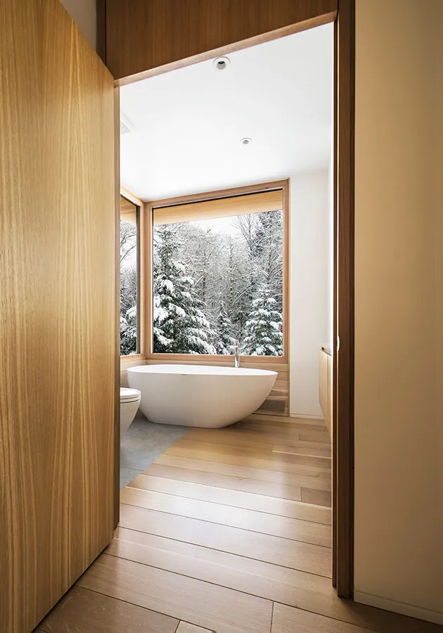 El uso de una paleta de materiales limitada (cedro blanco, concreto pulido, aluminio negro y vidrio) tanto dentro como fuera ayuda a borrar los límites entre la arquitectura y la naturaleza en esta casa diseñada por el estudio de arquitectura YH2.Fotografía: David Marien-Landry.