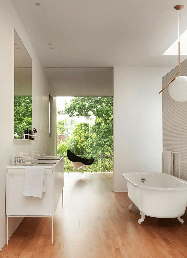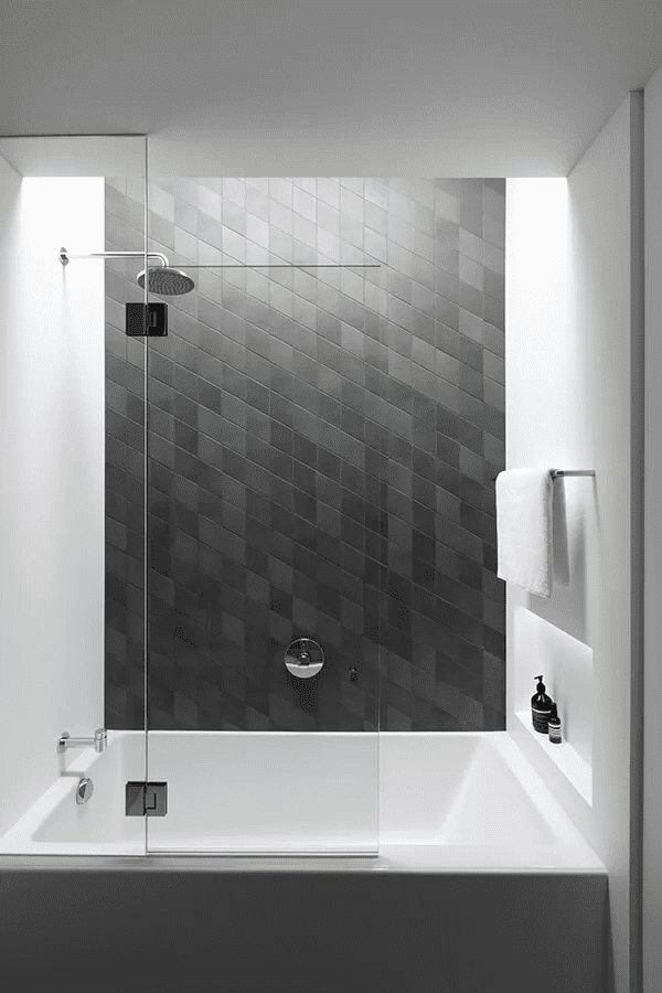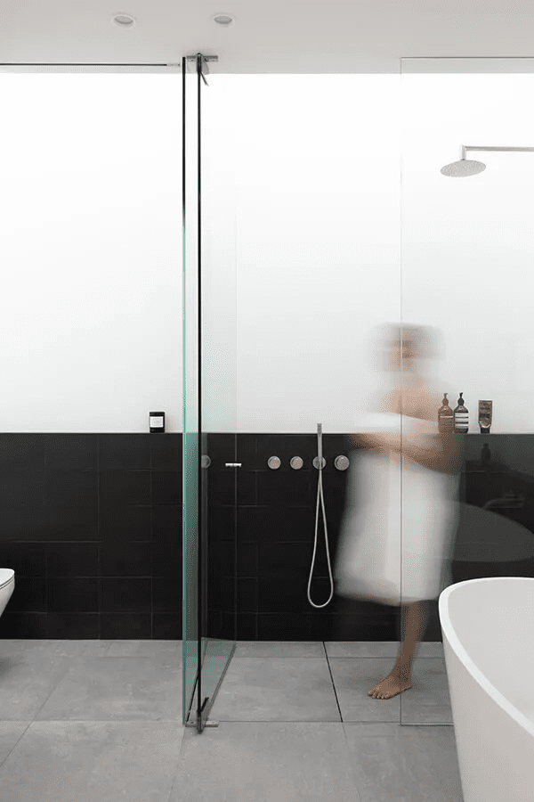 En el baño principal de esta casa de pequeño formato en Vancuver, Canada, el tragaluz inunda el espacio y la ducha con luz suave y difusa. Un diseño de Falken Reynolds. Foto: Ema Peter.