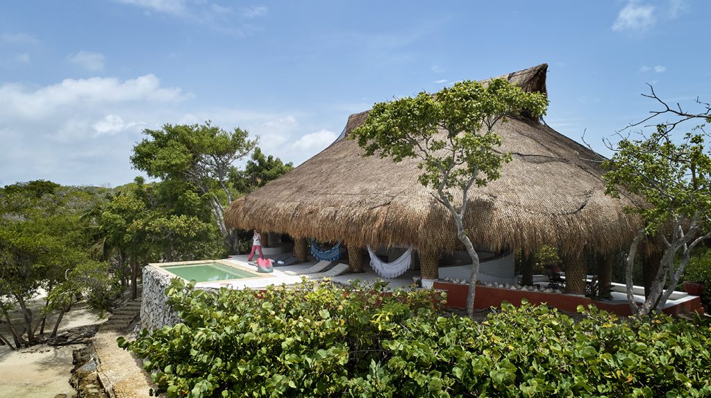 El diseño de esta casa se dispersa en el terreno, en forma de varios módulos sueltos en los que se distribuyen ocho alcobas, un área común y espacios de servicios, logrando una configuración que alterna la sombra de los árboles con el ambiente de los interiores –con techo de hojas de palma y pisos de cemento afinado–, mientras que en las zonas exteriores se extienden plataformas de madera de teca que permiten tomar el sol frente al azul del mar.