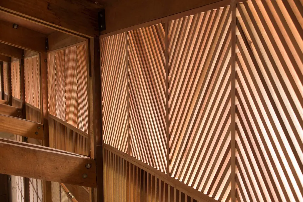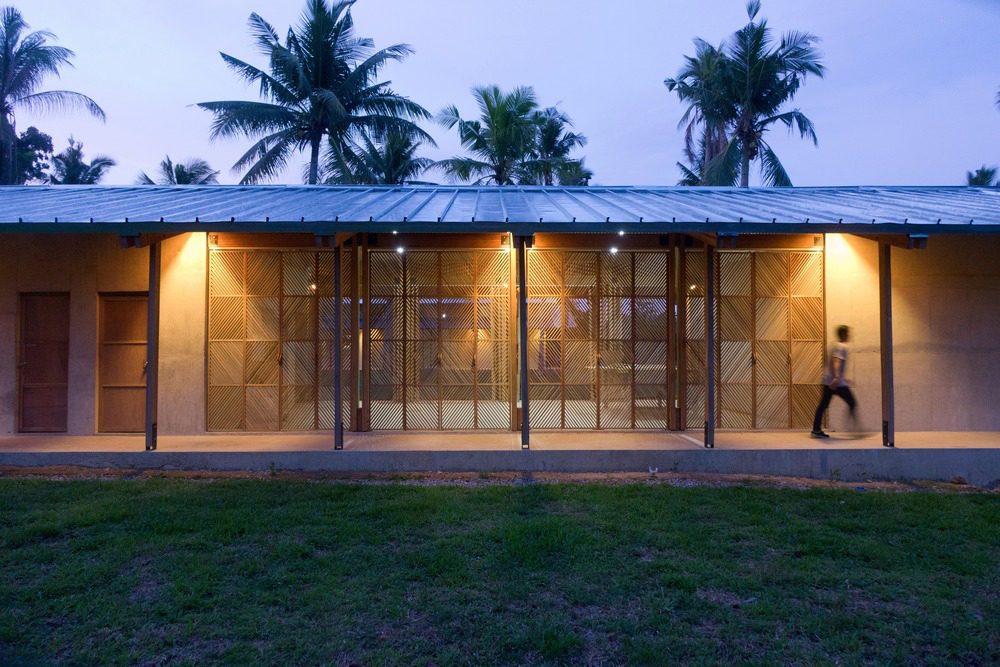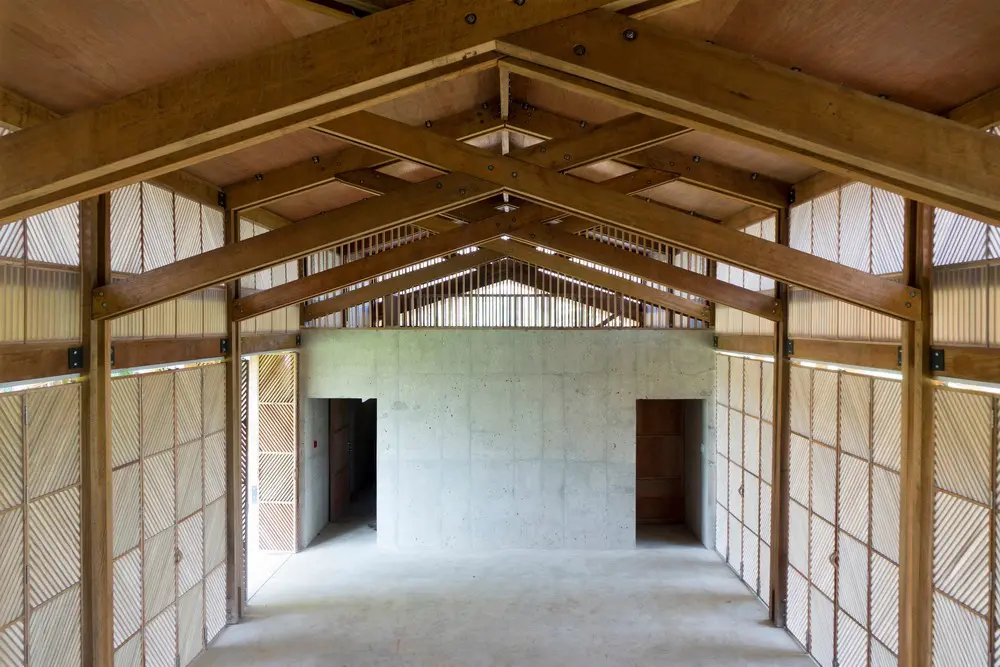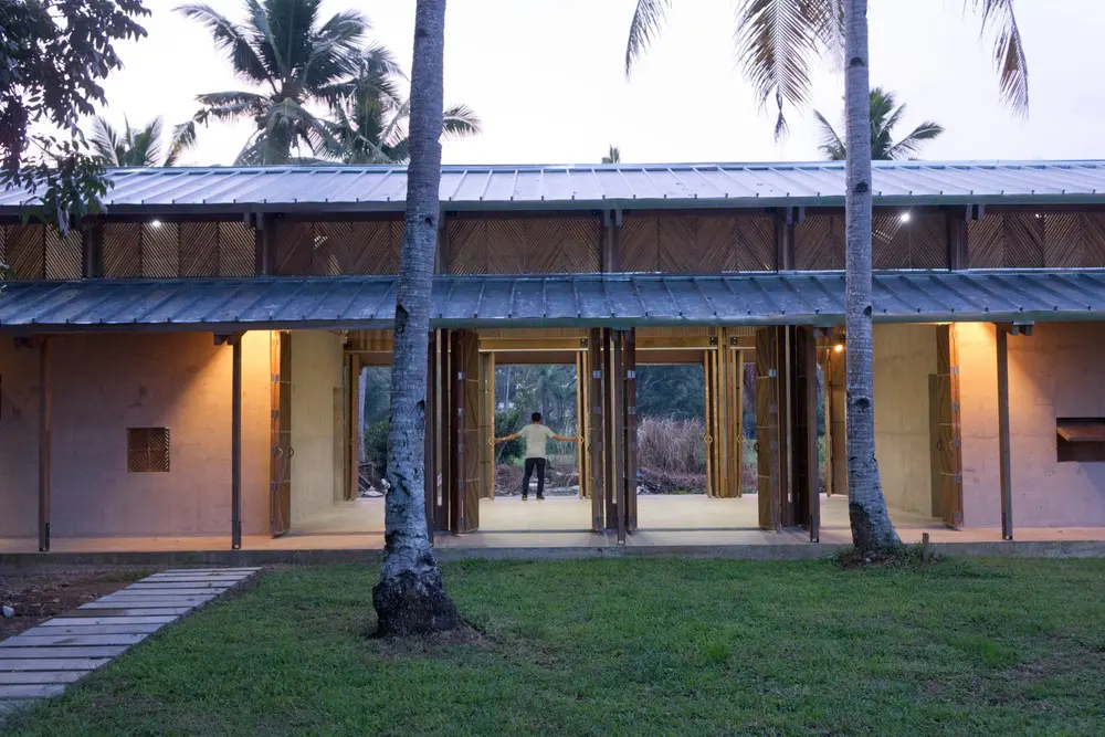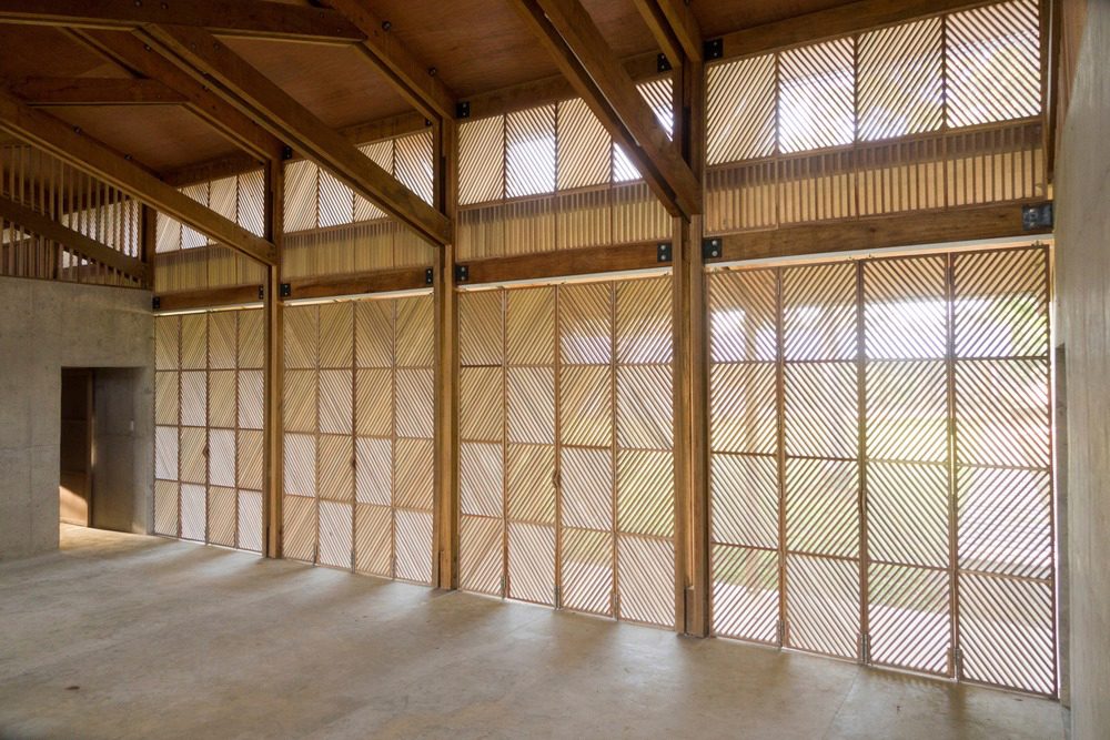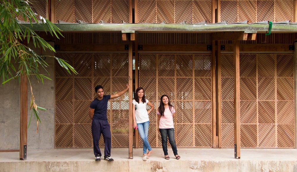 Los marcos de madera permiten que el aire fluya a través de los espacios mientras que los volúmenes de concreto proporcionan refugio durante los tifones. Las puertas y ventanas de listones de madera fueron diseñadas y construidas por los padres de los niños en el programa.
