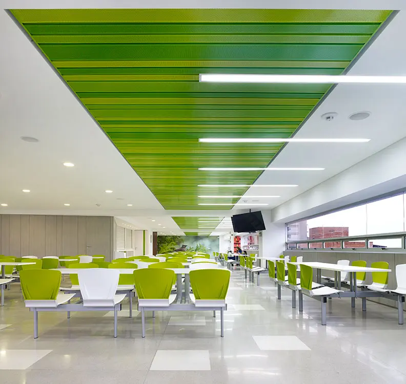 El cielorraso del hall principal lo construyeron utilizando cortasoles Aerobrise de Hunter Douglas, que generan un efecto interesante a partir del ritmo lineal y la variación de colores. El diseño propio del cortasol, cuya silueta podría asemejarse a la forma de un proyectil, le aporta a la composición final una imagen potente y diferente a la de un apergolado convencional. En la cafetería del piso 11 instalaron el cielo metálico Multipanel B, también de la misma firma, en tres anchos diferentes con diversas perforaciones, que crean un fuerte contraste de color y de textura con respecto a toda la superficie blanca y lisa del cielorraso restante.