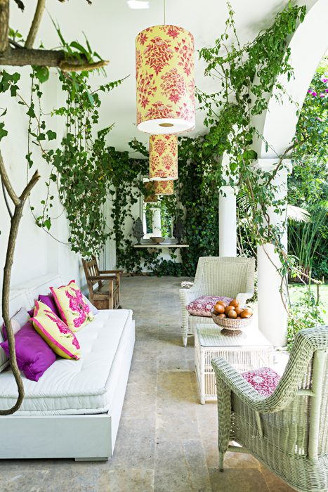 Su vegetación espesa, a pesar de que la casa está en la ciudad, la aísla y le da un aire a campo. También hay matas con flores que atraen colibríes y aves de paso, todas están cerca de la piscina, de ocho metros de largo y uno cuarenta de profundidad, que es de mármol Sinú, un material que al contacto con el agua adquiere la tonalidad verdosa, similar a la piedra de Java, tan común en Indonesia.