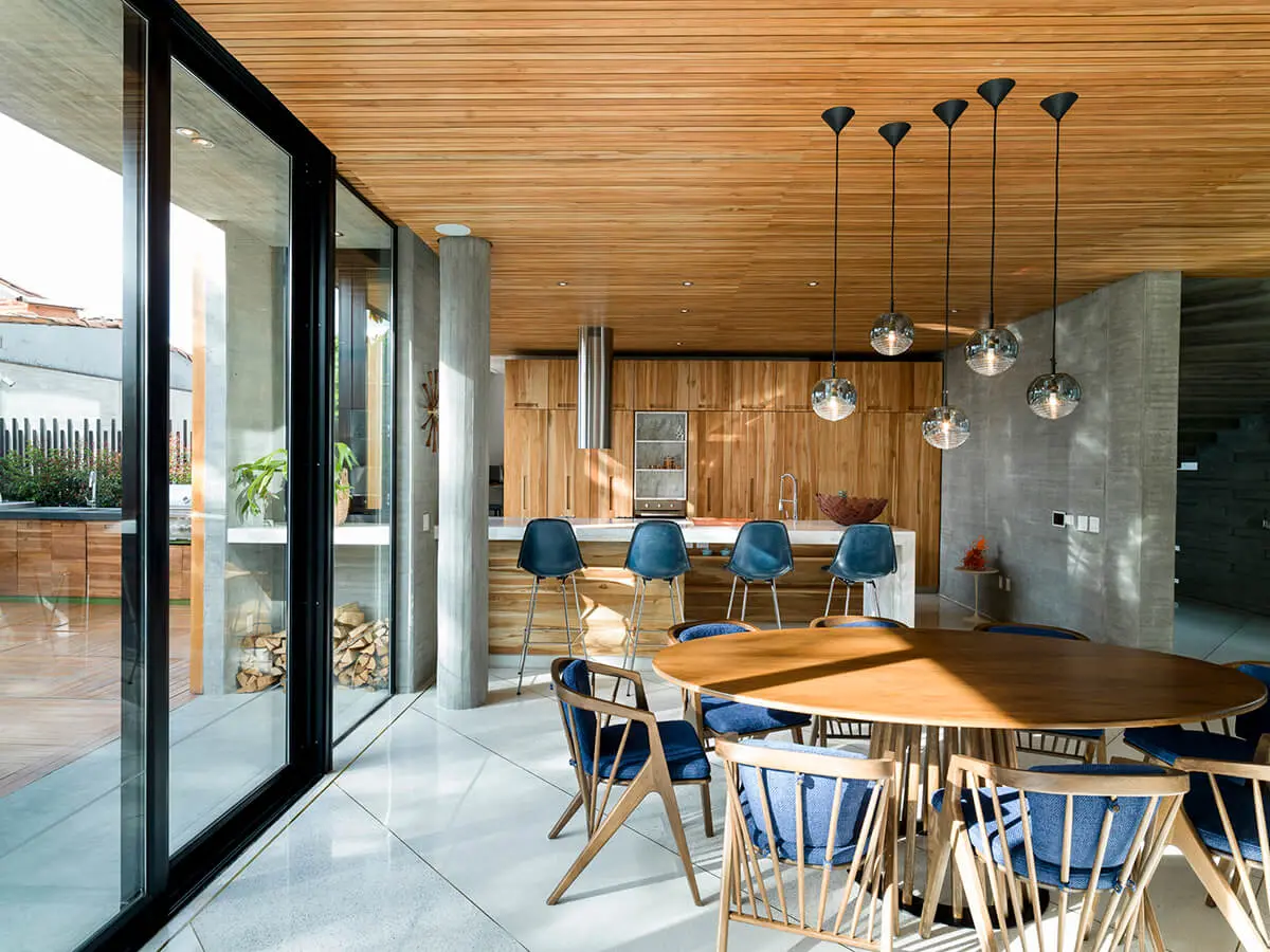 La luz natural penetra los espacios a través de grandes ventanales y claraboyas, creando un ambiente sano y agradable que se complementa con la presencia de frondosos jardines de vegetación nativa. A partir de la recolección de aguas lluvias y el reciclaje de aguas grises, que luego se usan para el riego y mantenimiento de los jardines, la casa se posa de manera consecuente con su entorno, garantizando un uso racional de los recursos naturales.