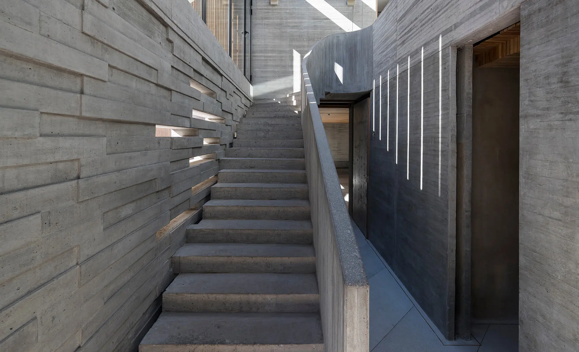 Su materialidad se restringió casi exclusivamente al vidrio, el concreto visto y la madera, la cual aporta su calidez al conjunto. El uso innovador del concreto fundido en sitio genera una infinidad de tejidos y texturas que le confieren diversidad y un carácter lúdico y agradable a los espacios interiores.