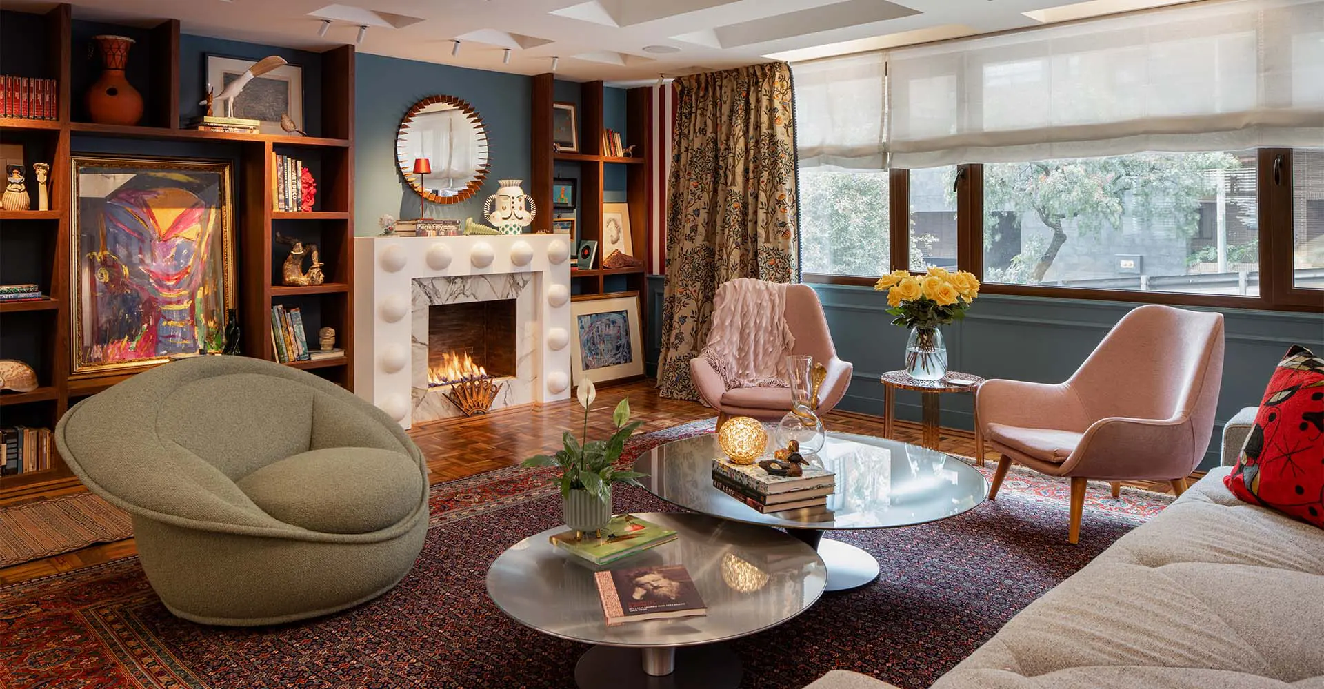 La omnipresencia del color, exaltada mediante dibujos de patrones, zócalos altos y molduras, compone un lenguaje original, inspirado en los interiores de las casas inglesas tradicionales. Esta estética pervive, reinterpretada con audacia para adaptarla a las formas de vida actuales.
