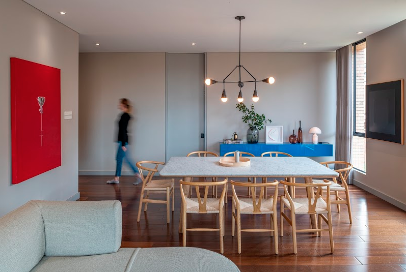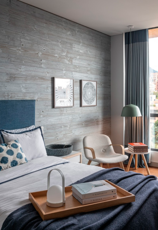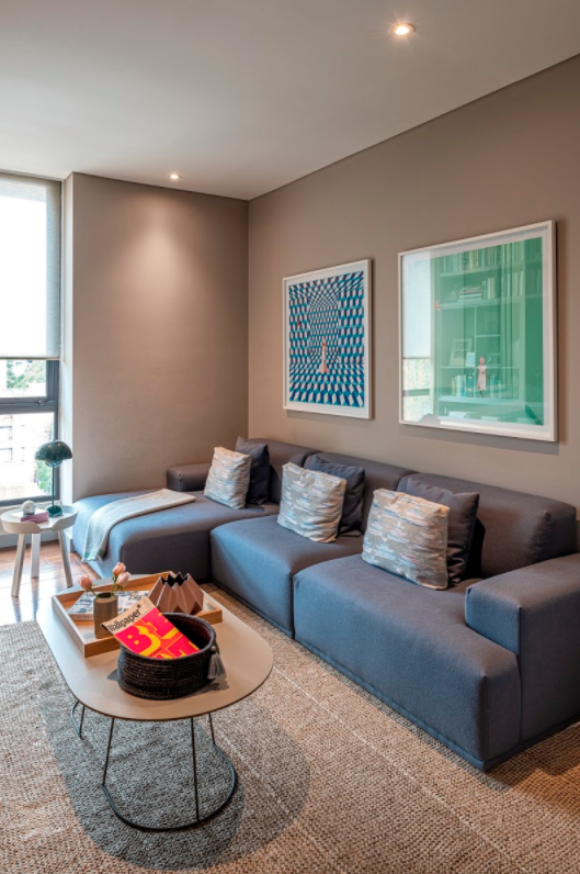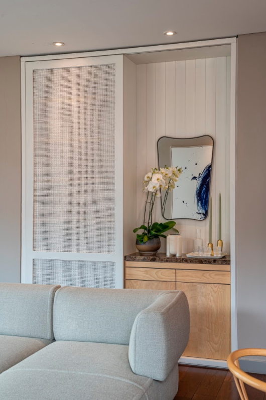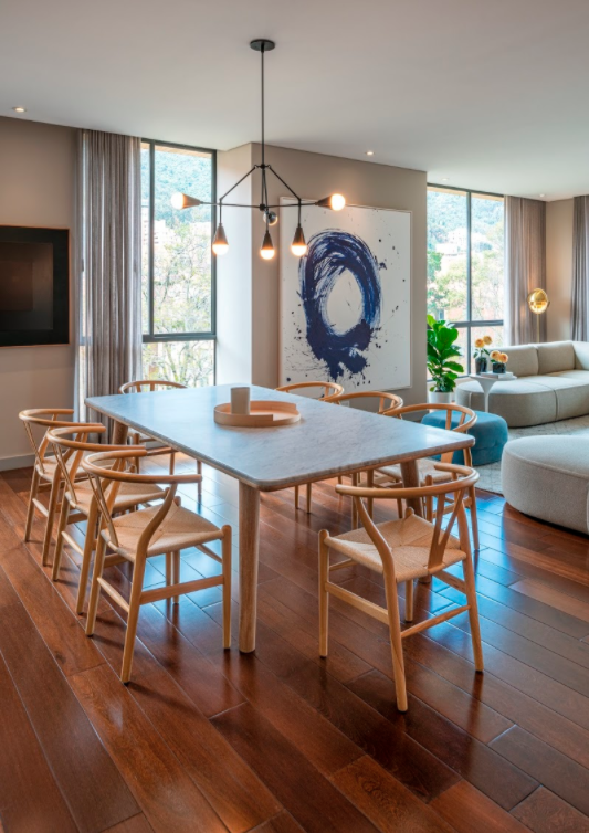Los herrajes de las puertas sí los cambiaron por unos de color negro mate que acentúan el carácter moderno del apartamento. Debido a que el edificio está localizado en un sector de construcciones altas, la luz natural en algunas horas del día es escasa, por lo cual era indispensable iluminar el interior mediante el uso de una paleta de tonos claros. “Jugamos con una gran variedad de colores y texturas a fin de ganar luz. Esto, a su vez, nos permitió dinamizar los ambientes para que se percibieran más frescos”. Lo anterior está reflejado en el papel de colgadura del vestíbulo, cuya materialidad compuesta de lino y lana transmite calidez y confort, y en la consola azul cobalto de la sala –diseño de Moggio y Berg– que impregna de color el ambiente. Al igual que la carpintería, mantuvieron la distribución para potenciar la espacialidad a través del mobiliario y la decoración.