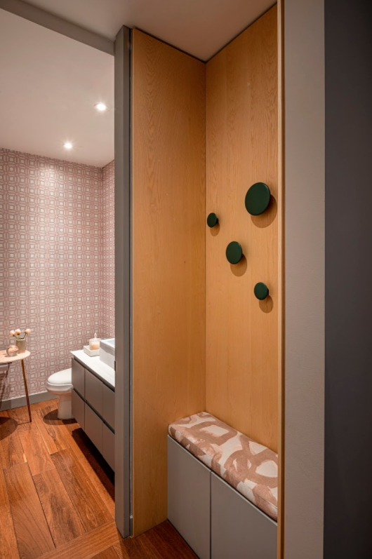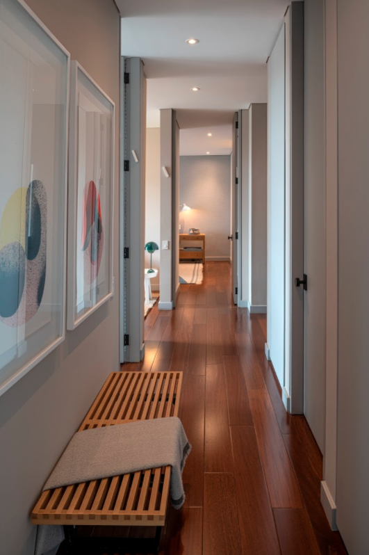 “Dado que conocíamos a los clientes, pues ante todo son nuestros amigos, teníamos absoluta libertad para crear”. Con esto en mente, compusieron una atmósfera de identidad propia. De lo anterior se desprenden algunos aspectos que Moggio y Berg tomaron en cuenta al momento de diseñar la propuesta. El primero de ellos era hacer de la funcionalidad un criterio base de la composición espacial, puesto que los dueños permanecen bastante tiempo en casa. Para esto buscaron aumentar la cantidad de luz natural y ampliar las áreas mediante diferentes estrategias, como la optimización de los espacios de acuerdo con las necesidades de los usuarios y el manejo de luces y sombras en función de las actividades cotidianas. El segundo correspondía a la importancia de conservar la carpintería, que estaba en excelentes condiciones y, por tanto, no ameritaba reemplazarla; optaron entonces por restaurarla y darle un acabado original en poliuretano.