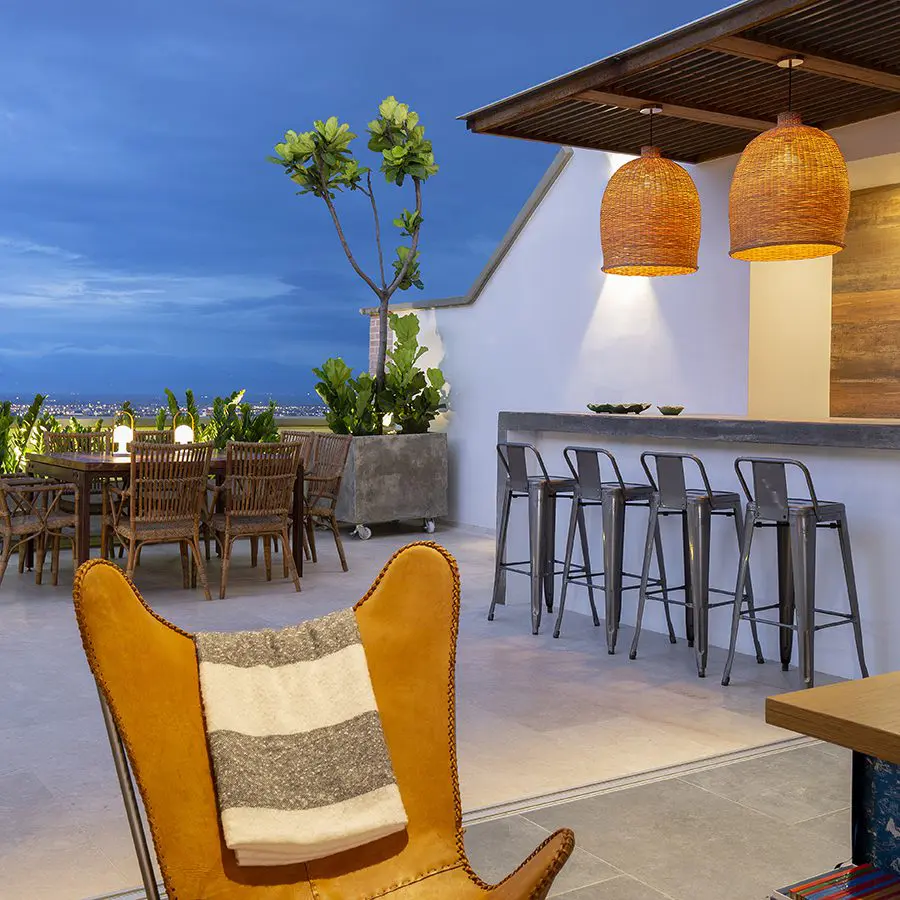 A diferencia de la terraza de la sala, la del último piso cobra protagonismo gracias a sus dimensiones. De hecho, esta se divide a su vez en tres áreas: BBQ, sala de juegos y piscina, con un común denominador: el inmenso paisaje urbano que se observa desde allí.