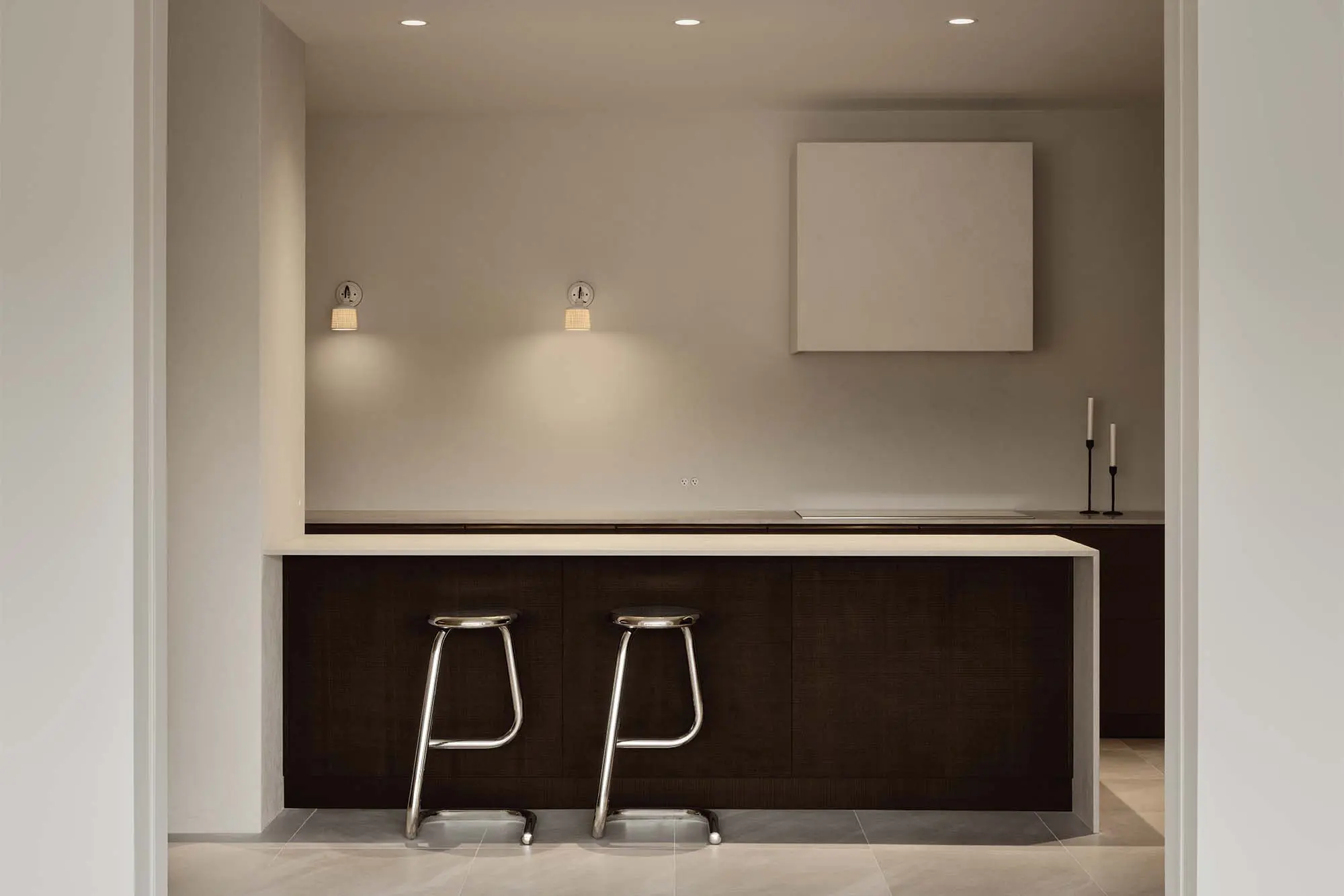 2. Los apliques de luz instalados en la pared alejan este espacio de su misión funcional.