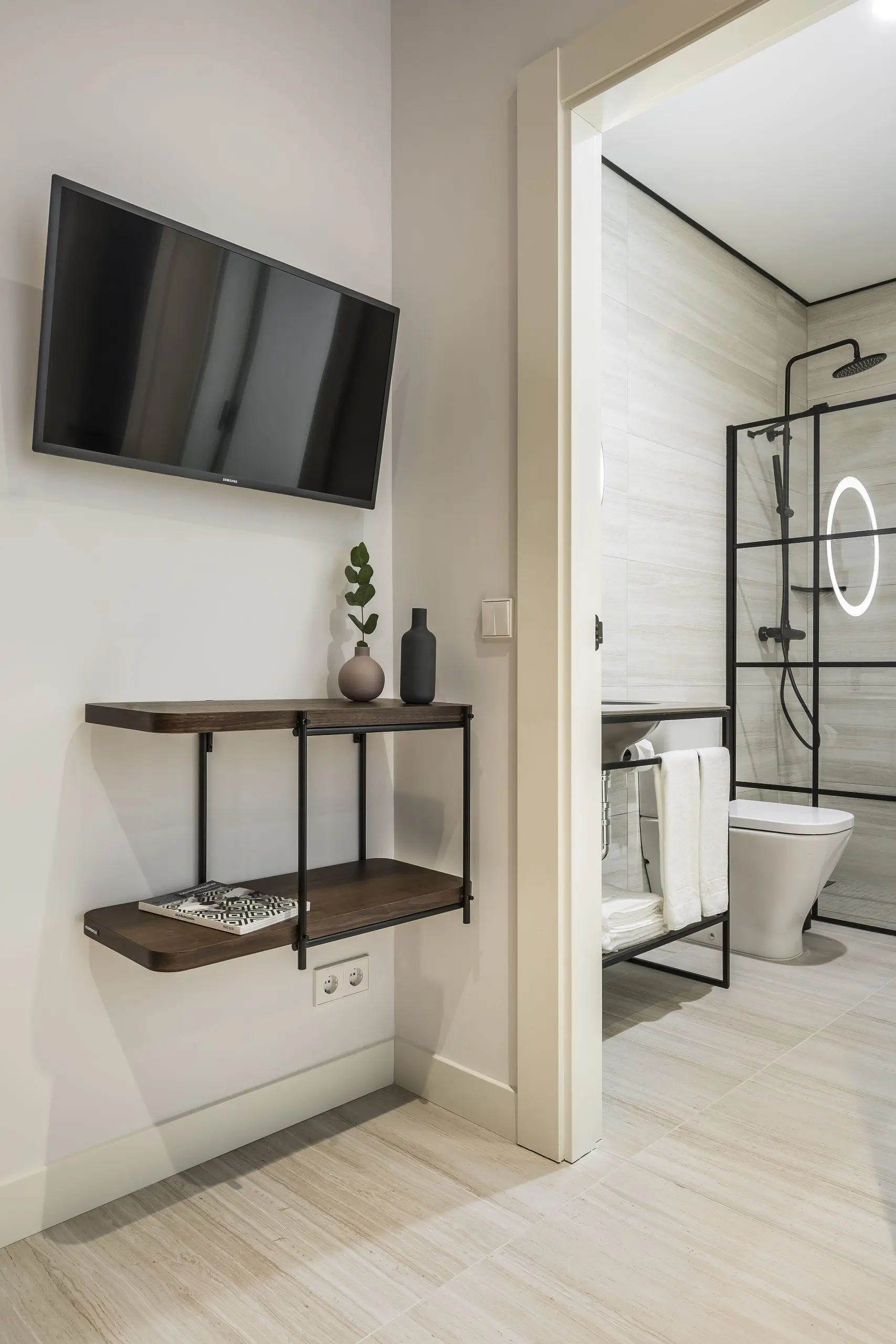 Finalmente, el borde superior de los muros es resaltado con una línea negra, un interesante detalle. El resultado de este ejercicio son apartamentos boutique ubicados en un simbólico edificio madrileño, cuya ubicación los hace perfectos para descubrir todas las bondades que ofrece la capital de España.