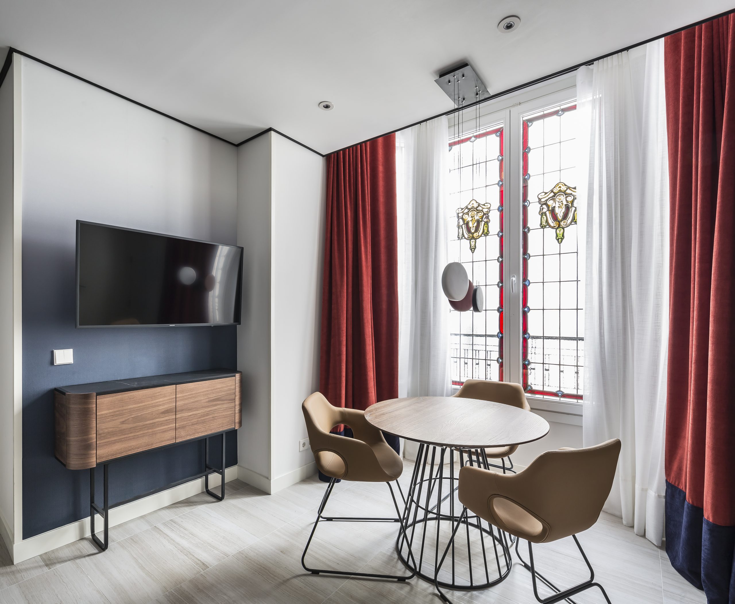 En general, el mobiliario empleado sobresale por la madera de vetas muy marcadas, mezclada con piedras como el mármol y con cueros tono mostaza. En cuanto a su paleta cromática, el azul de las paredes es combinado con el rojo de las cortinas de tela –estas con una interesante caída- .