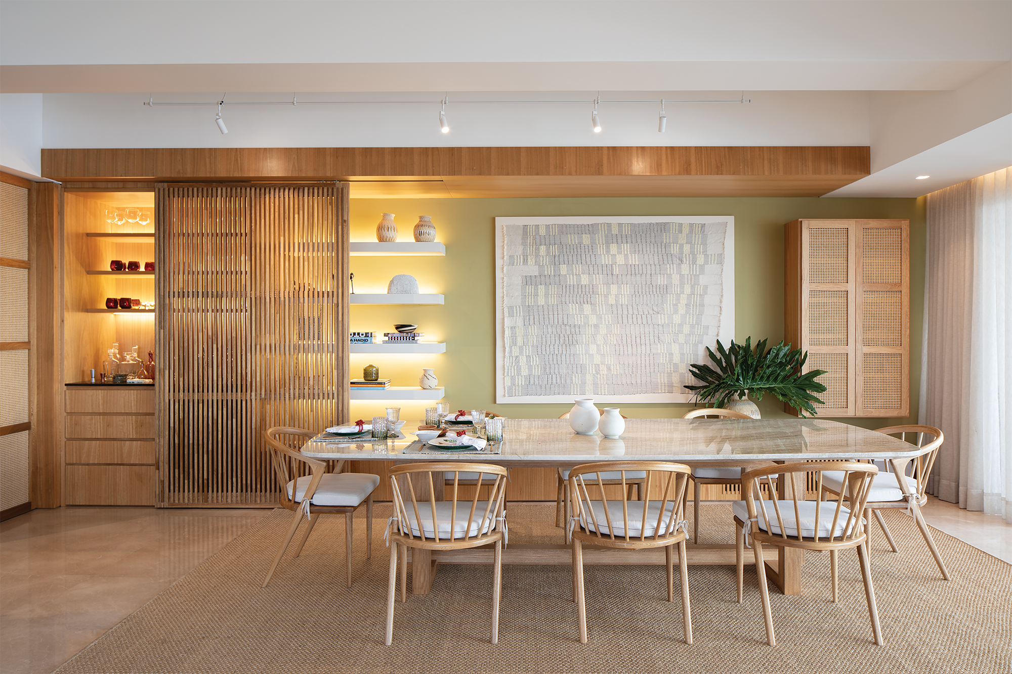 Los acentos de color se encuentran en determinados elementos, como en este caso, donde el verde del muro aporta contraste no solo respecto a los acabados, sino al azul del mar que se extiende delante del apartamento. Un interesante detalle es la puerta corredera hecha con listones de madera, lo que permite que se aprecien sutilmente los objetos que oculta y el trabajo de iluminación.