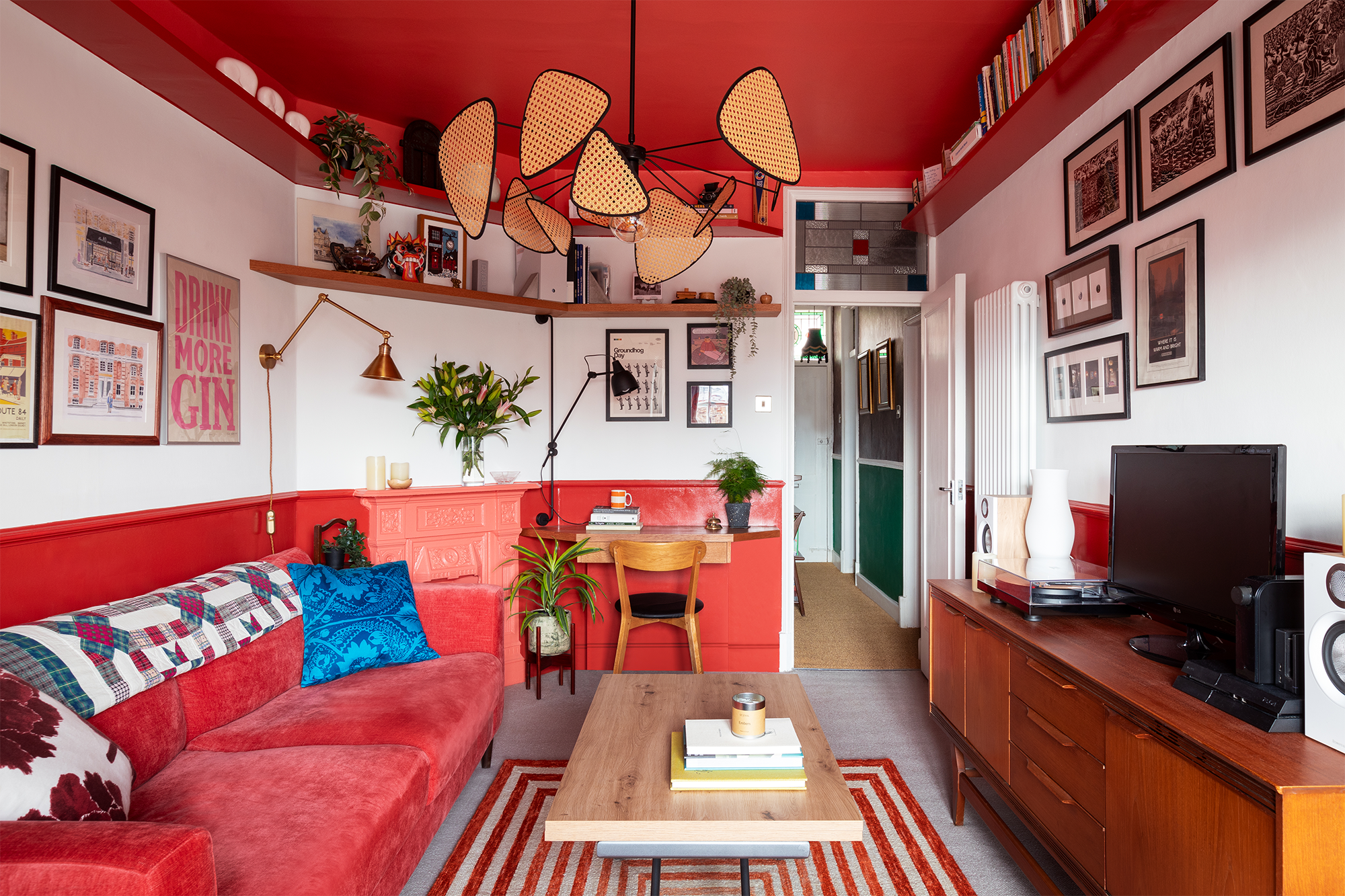 El rojo, presente en las zonas superiores e inferiores de las paredes, contrasta con el blanco neutral de la franja central, que actúa como un lienzo para los objetos decorativos de los propietarios.