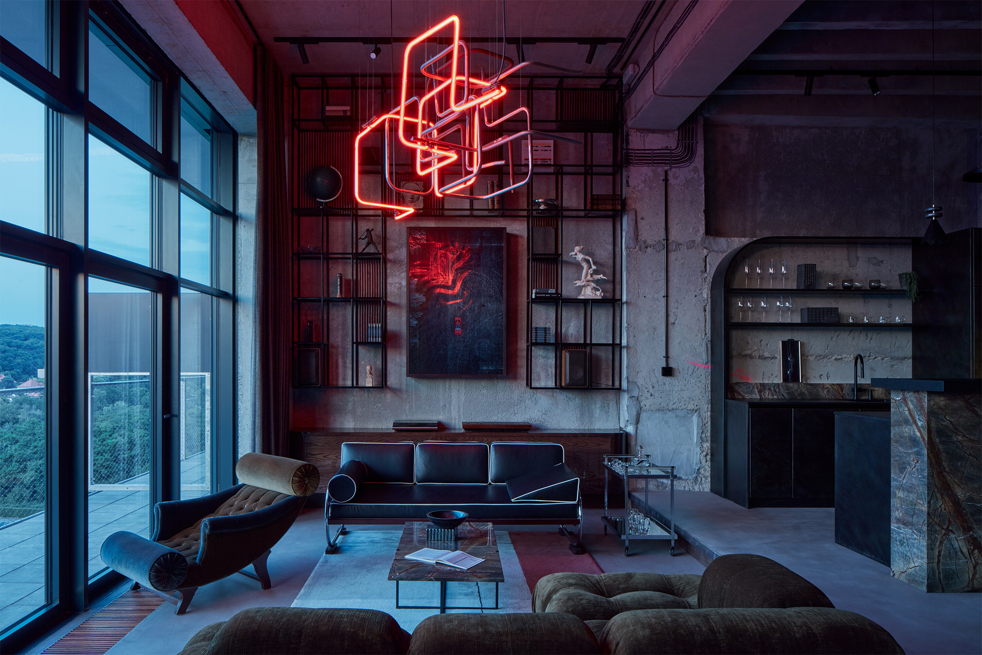 El salón del club ofrece un ambiente relajado, con cómodos sofás, una mesa de café y una elegante estantería geométrica. Aquí, la formalidad pasa a un segundo plano. La ventana de tamaño generoso y una puerta de vidrio permiten un fácil acceso a la terraza, ampliando eficazmente el espacio. Una cálida luz de neón roja realza la atmósfera relajada, que recuerda a los viajes nocturnos por ciudades desconocidas y bulliciosas.