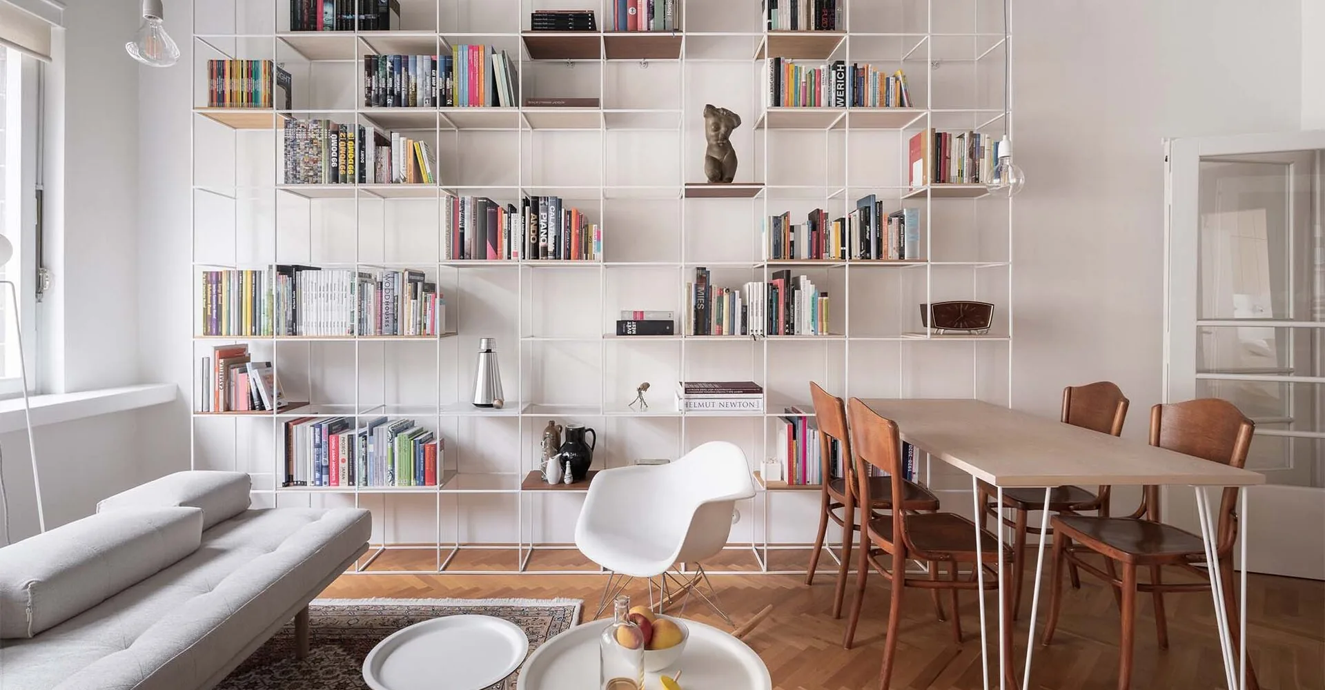 El diseño del apartamento Se llevó a cabo una renovación arquitectónica completa, que incluyó todo el equipamiento técnico del apartamento, la construcción del suelo y todas las superficies. Se decidió dejar a la vista y limpiar el techo de hormigón armado del salón (que por lo demás estaba cubierto con plafón y yeso) y convertirlo en un elemento artístico original. Además, se renovaron las ventanas, puertas, todos sus herrajes originales y se sustituyó el suelo de parquet de roble original por una réplica exacta. El cambio de distribución consiste principalmente en el nuevo uso de la cocina original y la demolición completa de la despensa y el baño originales, que se sustituyeron por un nuevo bloque de muebles insertado con espacios de almacenamiento, un baño amplio oculto y parte de la cocina. Esta nueva capa utiliza materiales tradicionales (una combinación de chapas de roble teñidas y laca blanca), pero de una forma completamente nueva, creando un nuevo espacio totalmente limpio y minimalista.