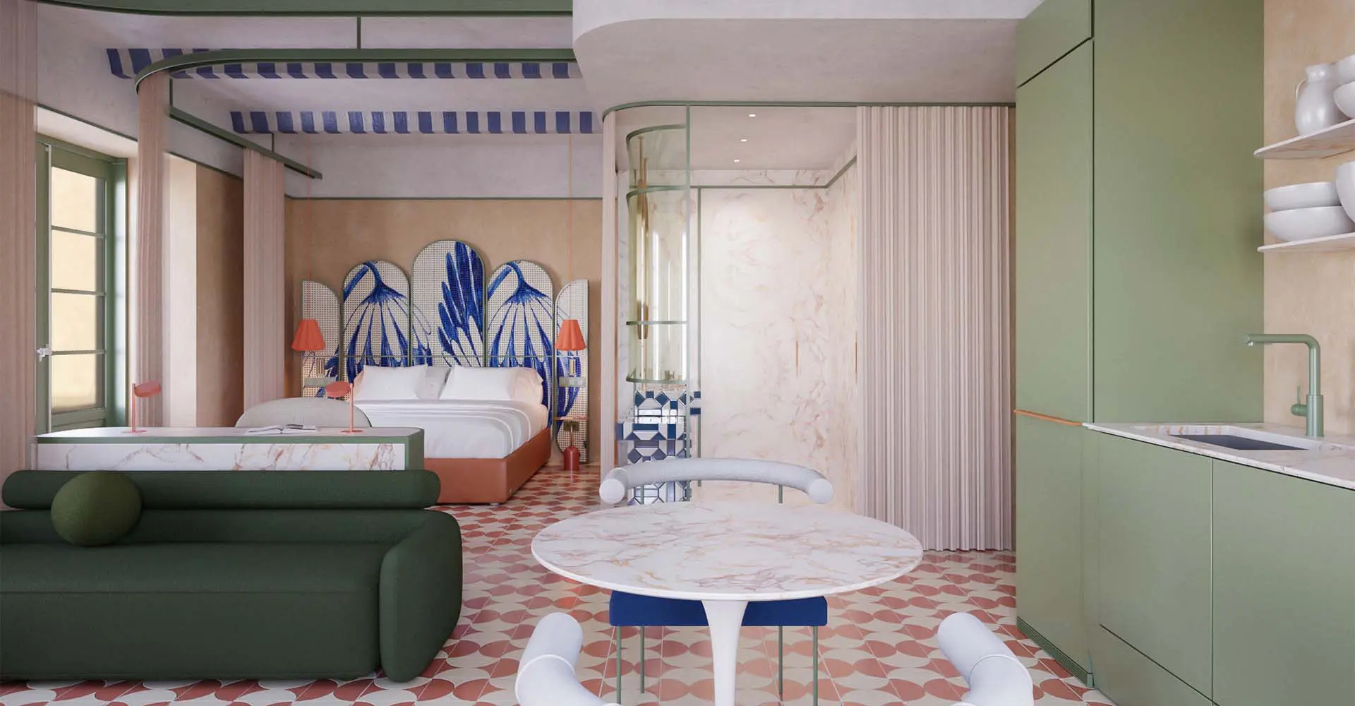 “El concepto de interiorismo de estos apartamentos (…) está profundamente inspirado en la esencia de Sevilla, particularmente en la cerámica de Triana, que se encuentra referenciada en numerosos detalles de la plaza de España».