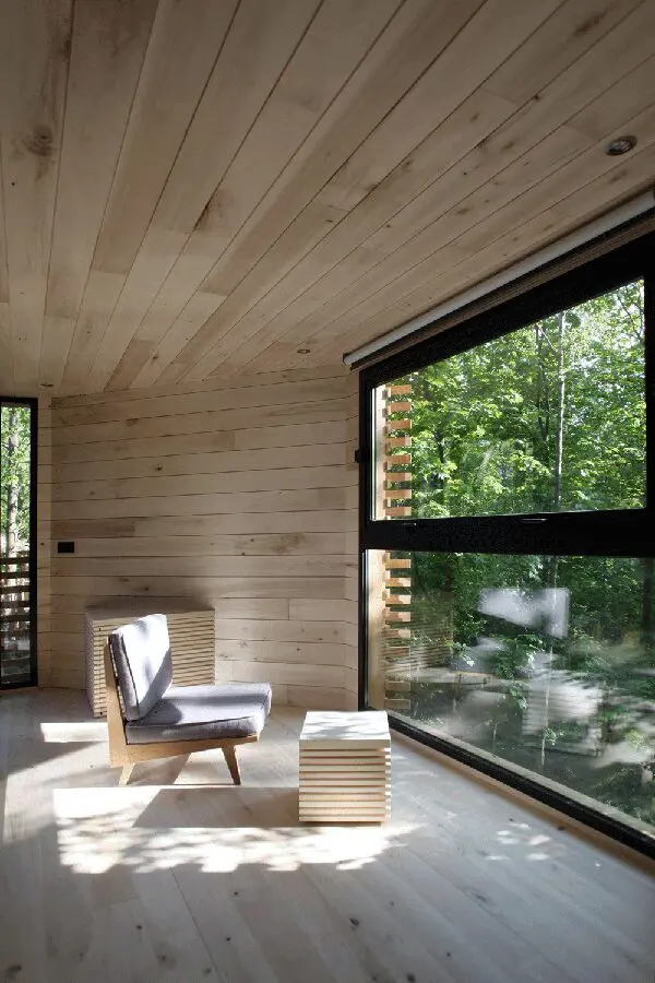 Las 10 suites evocan edificios primitivos en la orilla del lago, Atelier LAVIT se ha encargado del diseño de varias cabañas del complejo. La obra arquitectónica se adapta perfectamente a los tubos lacustres de los que se recupera y racionaliza el elegante empuje vertical. Las diferentes densidades de las pantallas de madera verticales alrededor de la cabaña garantizan la privacidad de sus clientes y la reparan del sol y el viento.