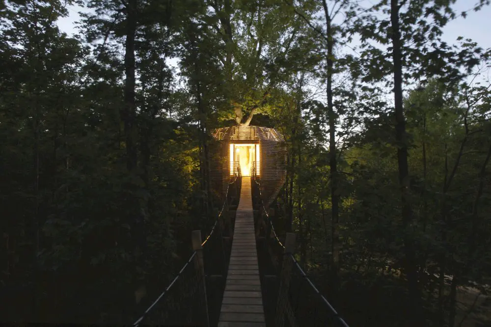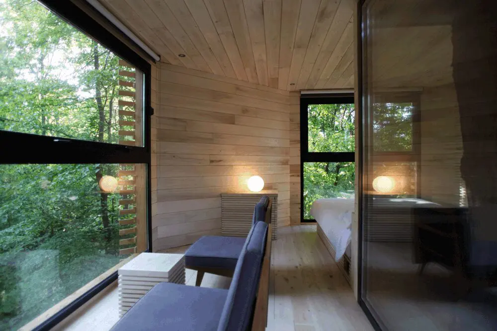 El reto arquitectónico para el equipo de diseño fue crear una habitación de hotel funcional y confortable de 23m² para Cabanes Nature et Spa, un Eco-hotel ubicado en una reserva de pesca en Aviñón, en Francia. Con un presupuesto de 120.000 euros y siendo fiel a la primera inspiración del proyecto: un nido de pájaros, el diseño de la cabina, junto con las técnicas de construcción, condujo a una racionalización de la lógica de ensamblaje de las ramas recolectadas por las aves para crear sus refugios resistentes.
