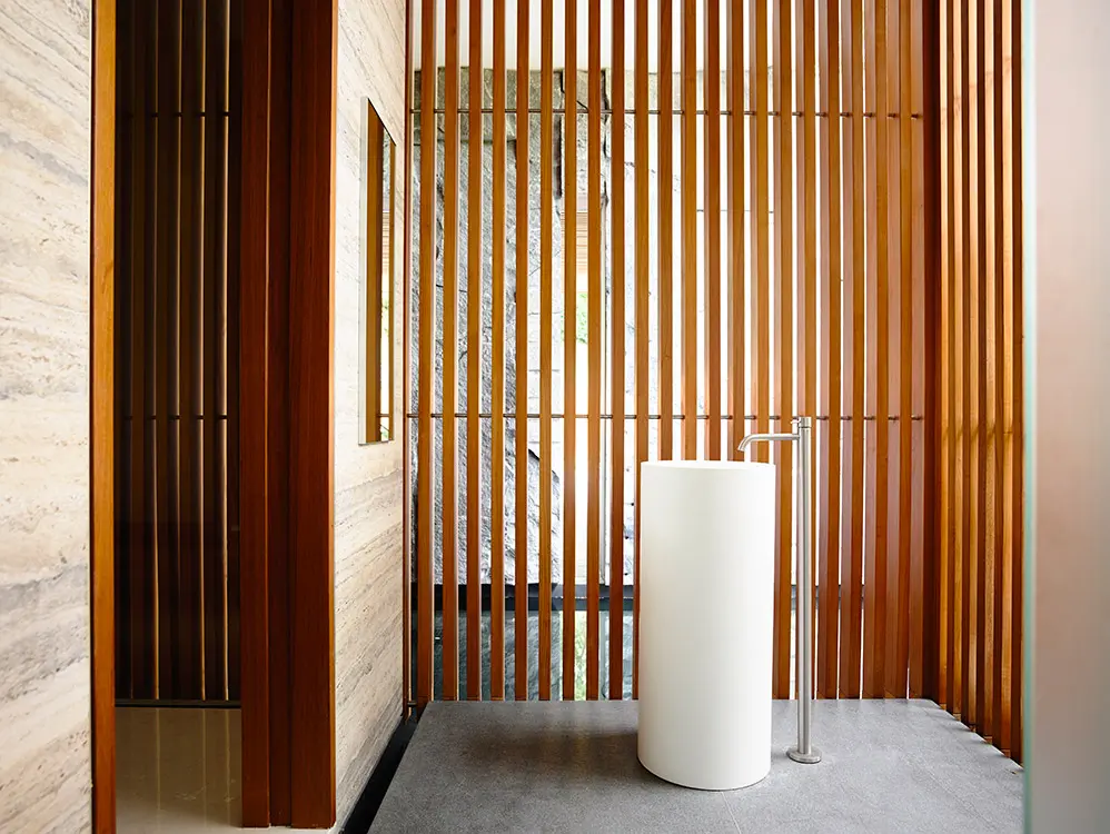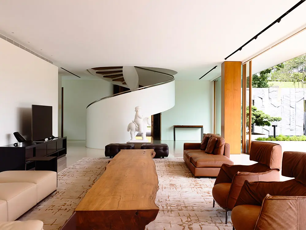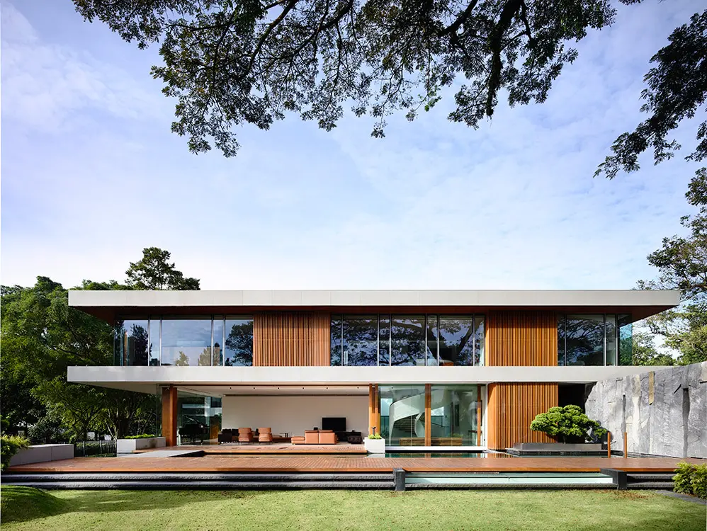 Hay un venerable samán ha estado presente desde los tiempos del Imperio británico y de la ocupación japonesa en la ciudad. Frente a él, se alza esta casa de líneas arraigadas en los fundamentos del diseño moderno. En ella se destacan el concreto, la madera e impresionantes bloques de piedra que muestran la huella de los barrenos de corte en la cantera.