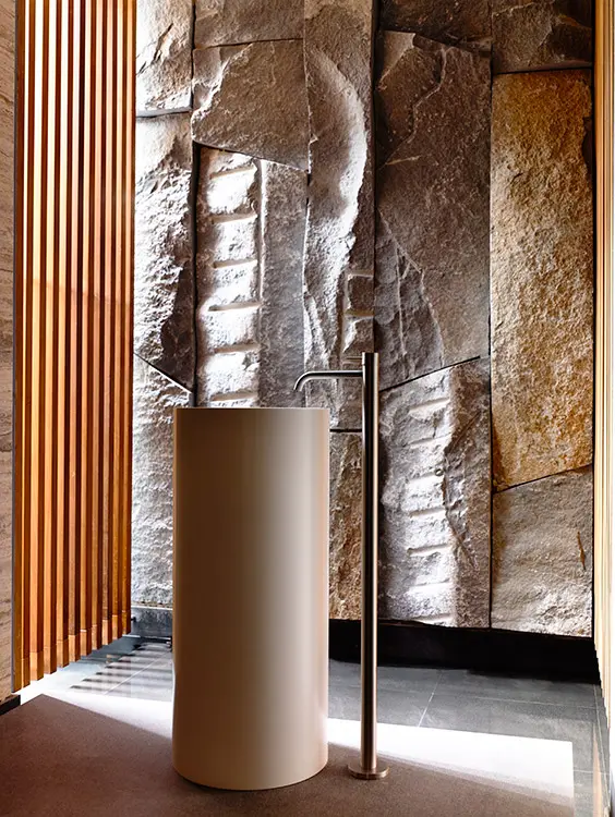La piedra masiva y texturada forma el muro, como de fortaleza, que separa la plazoleta de parqueo de las áreas sociales del primer piso. Además marca la entrada, como a una caverna, del salón de trofeos en el sótano.