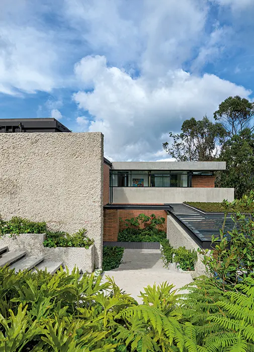 La pendiente del terreno permitió disponer de dos niveles en los que se organiza la distribución de la vivienda. Además, la escalinata que conduce al acceso principal atraviesa los volúmenes que integran la casa y el patio interior, este último ambientado con sofás de concreto en torno de un pebetero central y con un árbol dorado, aporte de Rebeca Piñeros, que se ocupó de la decoración.