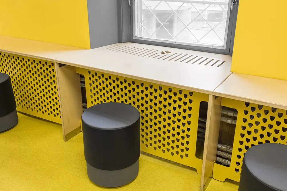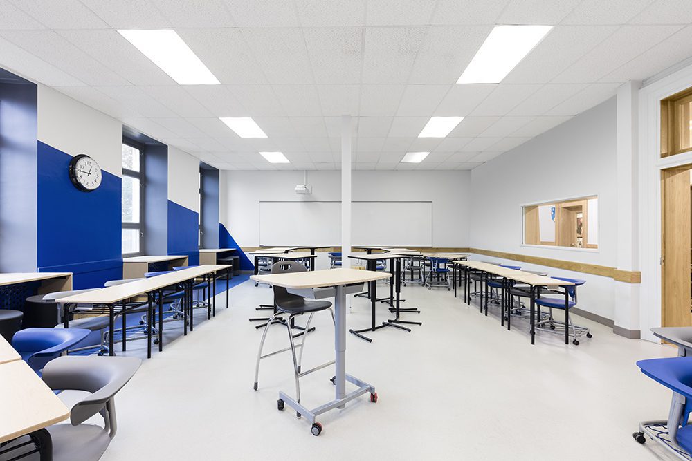Las clases se revitalizaron gracias a diferentes colores brillantes y con la adición de muebles móviles y de altura ajustable. El mobiliario ha sido especialmente diseñado para adaptarse a los diferentes comportamientos de aprendizaje de los estudiantes, permitiéndoles trabajar de pie o sentados.