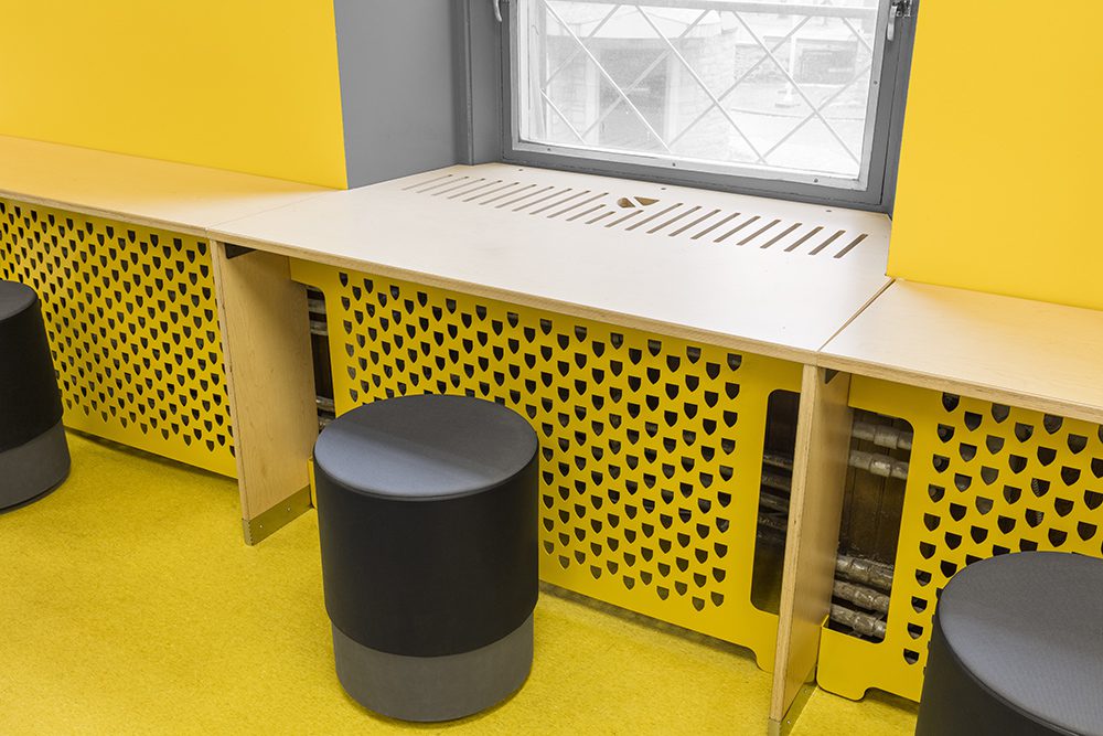 Los muebles empotrados a lo largo de las ventanas proporcionan un lugar adicional para trabajar individualmente o para reunirse en pequeños grupos en los bancos, al tiempo que proporcionan espacio de almacenamiento para los maestros.