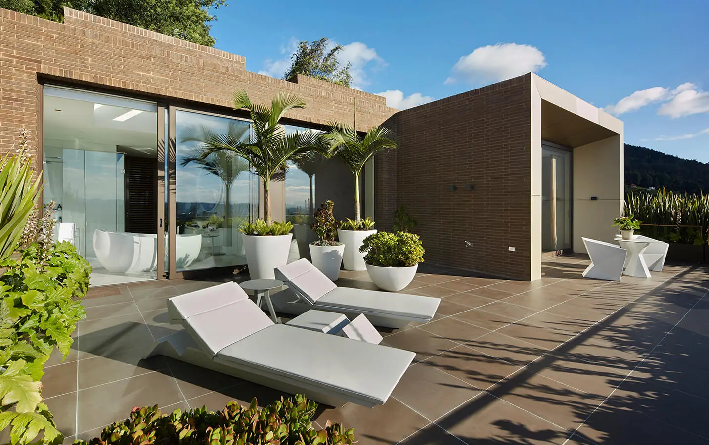 El piso está hecho en un microcemento de Cement Design, con unas líneas de césped que armonizan y crean una elegante entrada vehicular y peatonal que se integra a la naturaleza. Complementa esta zona la elaborada puerta de madera del garaje, a través de la cual se alcanzan a ver los autos deportivos del dueño. Para el resto de los exteriores eligieron vidrio, aluminio y un ladrillo color chocolate y de gran formato, un tono que en diferentes intensidades se repite en la gama cromática de las áreas interiores.