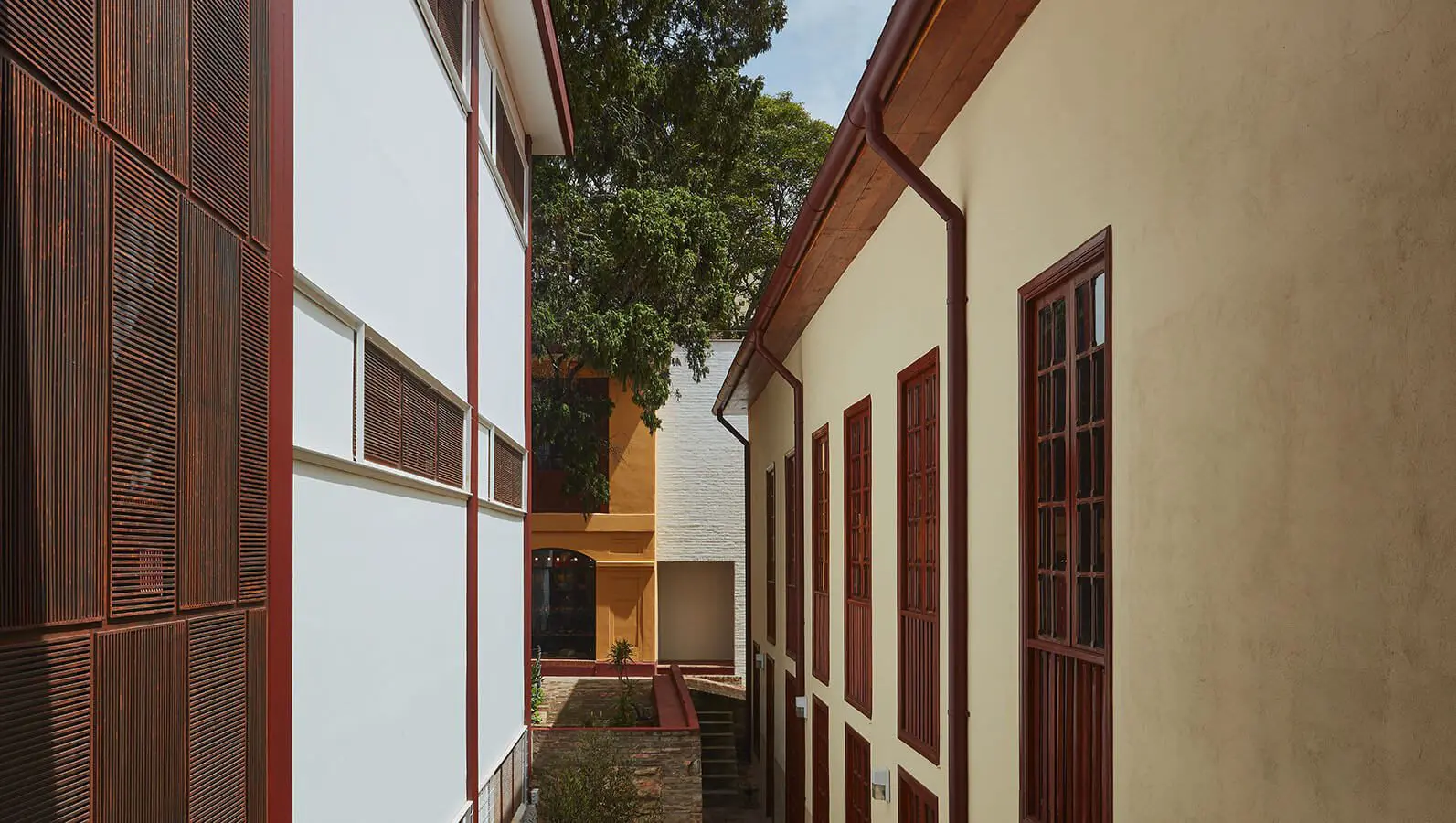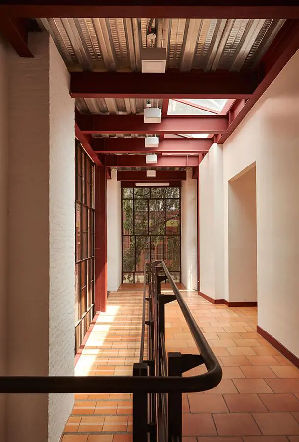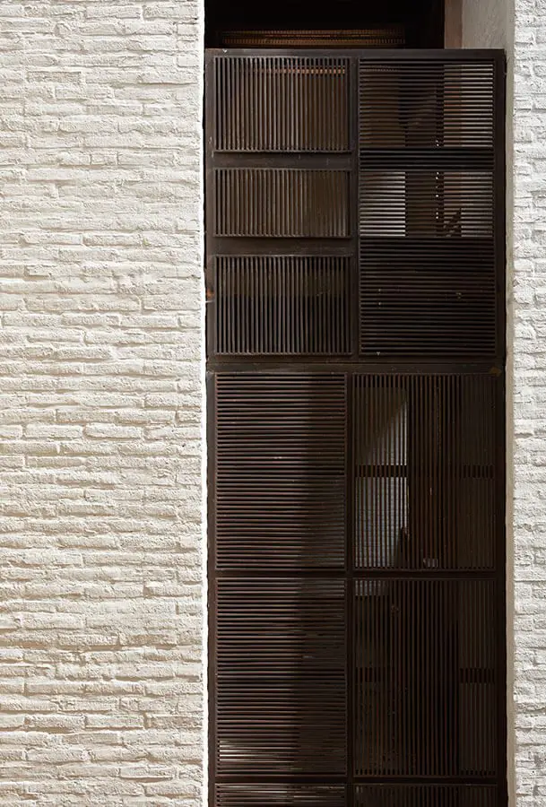 Y fue precisamente ese concepto, el de trabajo manual y artesanal, lo que los llevó a elegir los acabados. Mientras que en la obra principal de restauración trabajaron con cal, arena y boñiga, Octubre optó por la pureza del ladrillo delgado y horizontal pintado de blanco, y la textura discreta y práctica del hierro oxidado de las celosías que remplazan las ventanas.