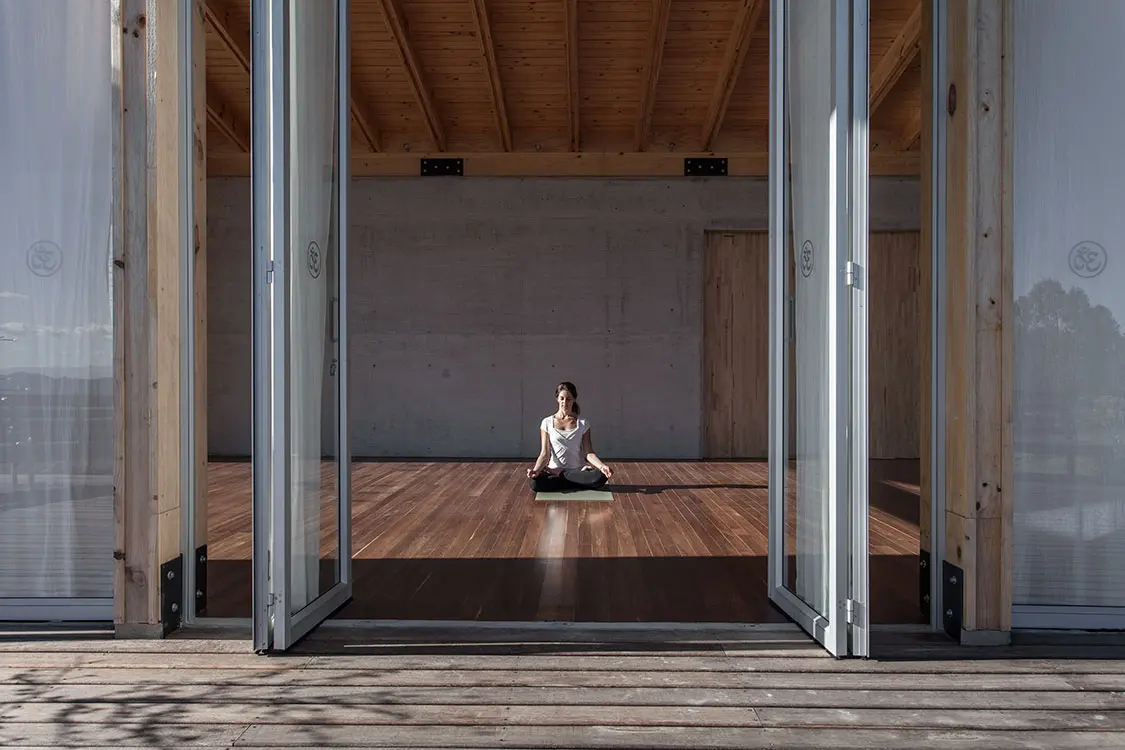 Frente al patio encontramos el volumen principal de la construcción, el cual aloja el salón de yoga: una planta completamente libre, con vidrios de piso a techo en tres de sus costados que difuminan el límite entre interior y exterior. Es un espacio lleno de luz que se apropia del paisaje, y que al abrirse y extenderse hacia la terraza termina de fundirse con su entorno natural.