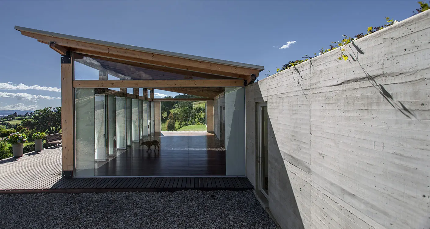 Las cubiertas inclinadas del salón de yoga y del comedor/cocina enfatizan la intención de integrarse y proyectarse hacia el paisaje, permitiendo que estos espacios sean bañados por una gran cantidad de luz y absorbiendo algo del calor del sol para comodidad de sus habitantes. Con el transcurso del día, la incidencia y el color de la luz cambian y los transforma por completo, ligando totalmente la experiencia a los ciclos de la naturaleza.