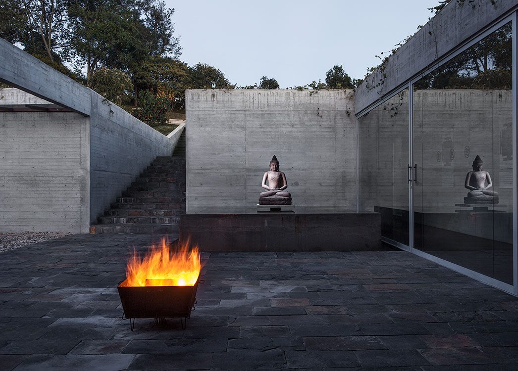 Abierto y en contacto permanente con el aire, su suelo acabado en piedra negra hace una clara alusión a la Tierra. En uno de sus costados resalta un pequeño volumen, un espejo de agua sobre el cual levita la imagen de Buda. En el centro del espacio aparece una chimenea para albergar el fuego. Aire (vaiú), tierra (bhumi), agua (ap) y fuego (agní); el patio central contiene en sí mismo los cuatro elementos principales que, junto al omnipresente éter (akashá), conforman los cinco grandes elementos que componen la naturaleza según el hinduismo y el budismo temprano.
