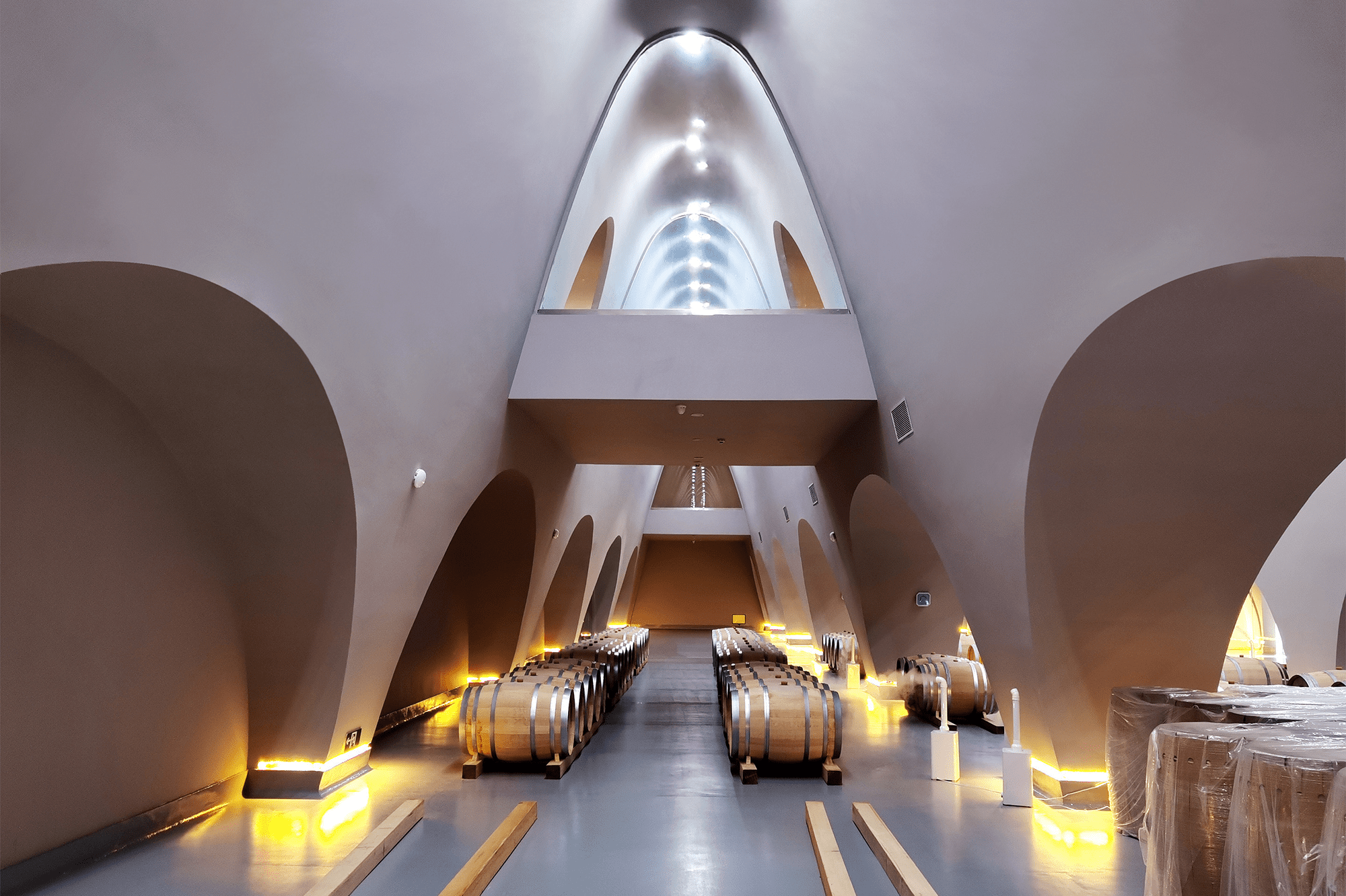 Escondida al pie de la Montaña Nevada, la bodega con un flujo de proceso intensivo, eficiente y de arriba hacia abajo, aprovecha la diferencia de altura del sitio, logrando el equilibrio del movimiento de tierras del proyecto.