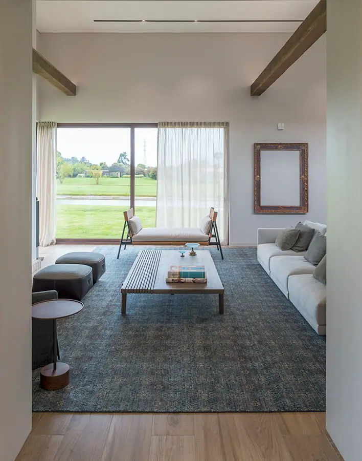 Un elemento importante, cuyo formato connota una puesta de espaldas a los modelos convencionales, es la biblioteca que divide la cocina del comedor. Su diseño fluctúa entre el lleno y el vacío. Consiste en una masa ortogonal horadada para crear una conexión visual entre ambos espacios. De hecho, en ella no solo hay libros, también algunas piezas decorativas, las cuales añaden un caleidoscopio de azules oscuros y dorados brillantes. “La transparencia es su cualidad más importante. La diseñé con la intención de que fuera funcional, pero también estética”.   Esta casa en la sabana fue diseñada para acercarse a la naturaleza durante las vacaciones y los fines de semana