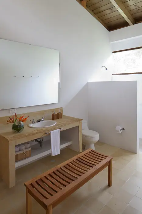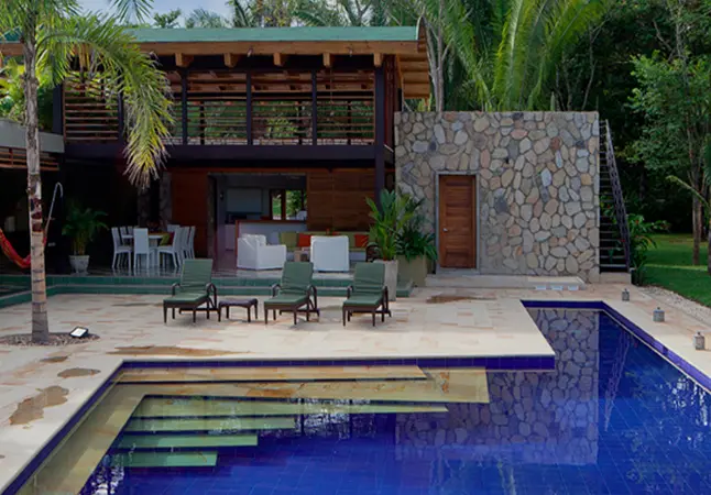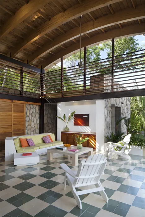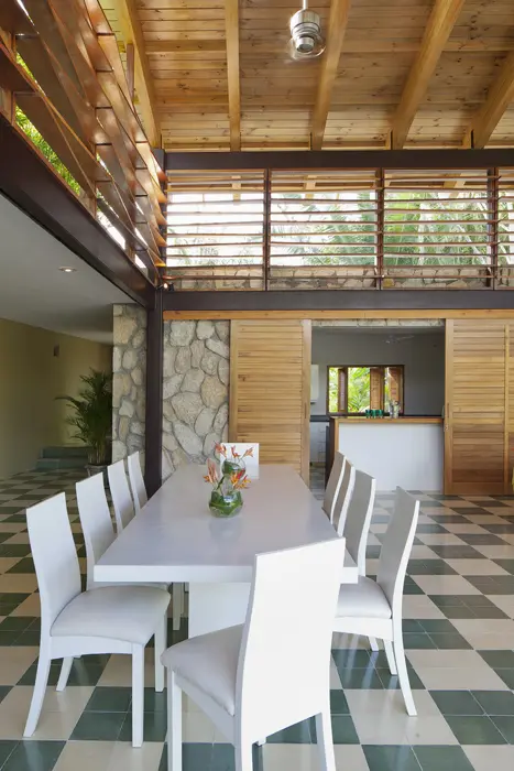 El aire atemporal, que recuerda las casas de campo de otras épocas, lo aporta el piso ajedrezado en baldosa de cemento, la cual, en tonos marfil y verde, se usa en toda la casa. La construcción refleja la naturaleza del lugar con el uso de muros de piedra, material que, en tono claro y textura lisa, recubre los pisos alrededor de la piscina y los escalones que se sumergen en el agua.